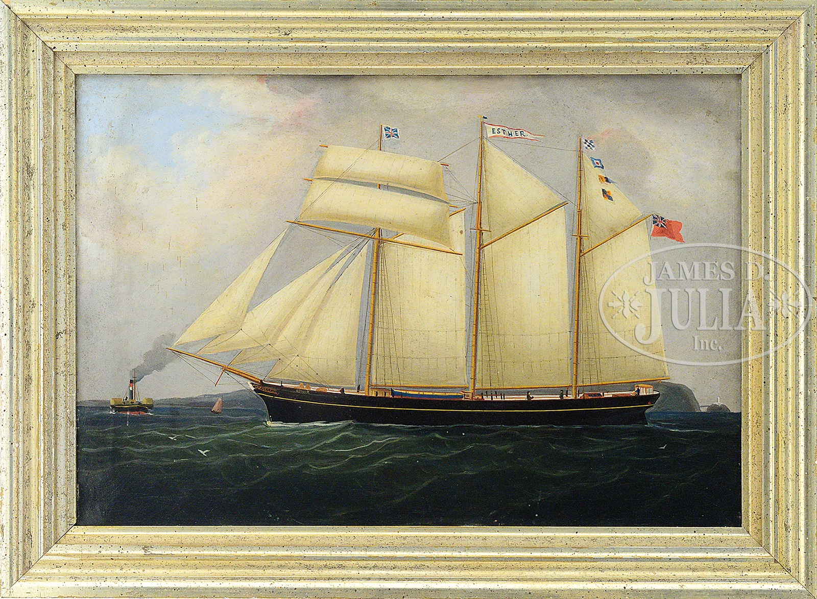 ENGLISH SCHOOL (19th/20th century) STEAM AND SAIL PORTRAIT OF THE TOPSAIL SCHOONER “ESTHER”.Unsigned oil on canvas portrait of the schooner “Esther” in full sail crossing the bow of a steam driven tugboat, with the Union Jack flying off her stern. Housed in a giltwood frame. SIZE: 18″ x 16-1/2″. Overall: 23-1/4″ x 31-1/2″ CONDITION: Discolored varnish, surface grime, old restoration in sails 49861-19 (4,000-5,000) – Lot 2172