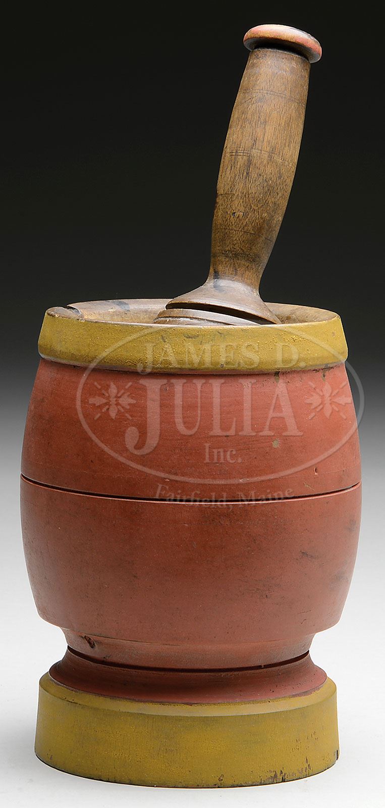 PAINT DECORATED TURNED WOOD MORTAR AND PESTLE. Early 19th century, New England. The barrel formed maple mortar with turned rim incised center band on a reel-turned stepped base decorated in original salmon paint with chrome yellow trim. The pestle with stepped shoulder, shaped handle and mushroom cap; the cap with conforming yellow and salmon paint. SIZE: 6-1/2″ T. CONDITION: Overall very good, with somewhat later painted surfaces. Tiny chip losses at base and small knot loss at rim. 9-91516 (800-1,200)