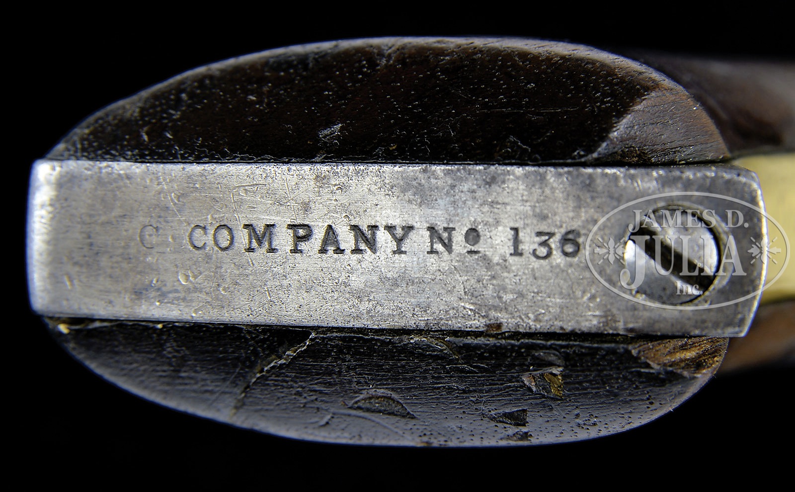 RARE MARTIAL COLT WALKER PERCUSSION REVOLVER.SN C Company #136. Cal. 44. Usual configuration with 9″ oct to rnd bbl, German silver front sight & 1-line “ADDRESS SAML COLT NEW YORK CITY” left hand address. Left side of bbl lug has the serial number & right side is marked “US / 1847” that is partially obscured by the wedge screw. Frame has the serial number on the left side and tiny number “136” on the front end between the frame lug pins. Serial number is also found on the trigger guard in very tiny letters & numbers and on the butt strap in larger letters & numbers. Cylinder is also matching numbered in tiny numbers & letters and cylinder retains its one orig safety pin. The brass trigger guard & steel back strap contain a 1-pc walnut grip with number “136” in the butt strap channel. Left side of front strap, under the grip and inside back strap are also numbered “136”. Left edge of butt strap, under the wood is numbered “44” which number is also found on the left ear of the grip. Bottom of the bbl, under the rammer handle has a number “4”. Face of cylinder also has a number “4”. Wedge is also marked with tiny numbers “136” and has the “3” stamped horizontally. Rammer handle is an orig Walker handle with slot for the retaining spring but has been converted to a horizontal latch, with latch stud in a dovetail about 1″ from the muzzle. It appears that the rammer handle spring dovetail was filled during the period of use to accommodate the conversion. As is well documented from numerous official sources there were 1,000 Martial Colt Walker revolvers produced in 1847 with design cooperation between Samuel Colt & Capt. Samuel H. Walker, for whom these pistols were named. The initial shipment of Walker pistols was to have been 220 pistols numbered “C” Company, Capt. Walker’s own company. These pistols were delivered to the Vera Cruz Ordnance Depot for issue to Company “C”, however it appears that Col. John Hays was the better politician and seized this shipment for his own company. Later Company “C” would receive 280 pistols numbered in the “A” & “B” Company serial series. It is also well documented that Capt. Walker was killed in combat at the battle of Huamantla on Oct. 9, 1847. When the war was over Col. Hays’ Company “C”, upon embarkation for return to the U.S. were ordered to turn in their issued arms. Of the 394 total pistols issued to Company “C” only 191 were turned in. Records indicate that 125 were lost in battle plus the 191 turned in (which were mostly unserviceable) accounts for only 316 of the total 394 that were issued, which indicates that about 78 of them were retained by the Texans when they returned home. The 191 turned in Walker pistols, of which only 82 were recorded as serviceable, were shipped to the Baton Rouge Arsenal. The last shipment of 500 Walker pistols were shipped to Vera Cruz in March 1848, and then returned to the Baton Rouge Arsenal in November 1848, unissued, minus 41 pistols that were stolen. In December 1848 all of the pistols at Baton Rouge Arsenal were shipped to the San Antonio Ordnance Depot where most of them were issued to dragoon companies & infantry regiments fighting Indians. By April 1850 all of the old model Walker pistols had been returned to the San Antonio Ordnance Depot and exchanged for the new 1st Model Dragoon revolvers. These Walker pistols apparently remained in that depot until February 1861 when they were surrendered to the Confederacy. Obviously the Confederate military would have issued them to their fighting units. An inventory of known Walker pistols compiled by Mr. W.F.S. Quick in Jan. 1953, lists “C Company number 136” as being owned by Charles W. Fritz of Norwood, OH. Of the 1,000 Martial Walker’s initially manufactured it is unknown just how many survived today, but of those that are known, very few survive in orig configuration with any orig finish. PROVENANCE: Collection of Dr. Douglas Sirkin. CONDITION: About fine, all matching except rammer handle which is obviously a period of use replacement. No orig finish remains being an overall gray metal patina with what appears to be traces of blue on the frame; trigger guard & front strap are a medium mustard patina; cylinder is matching patina with no remaining cylinder scene or pressure ridge; grip has chipped toes showing heavy wear with a repaired crack on the left side and some battering on the bottom edges. Mechanics are fine; strong bore with bright shine and scattered pitting. 4-49844 JR320 (75,000-150,000) – Lot 2173