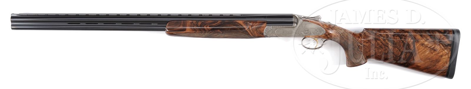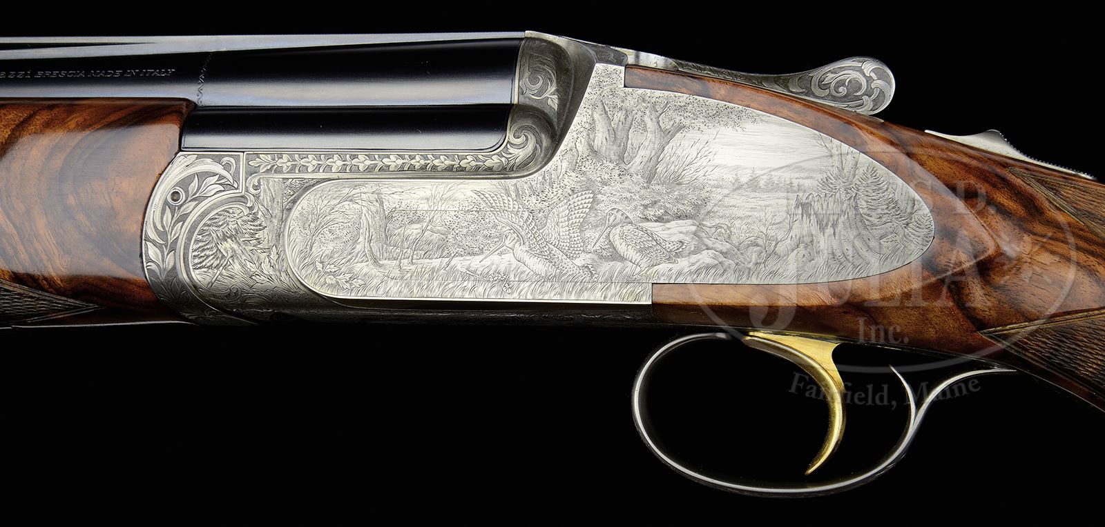 *VERY FINE GALEAZZI ENGRAVED PERAZZI MX8 EXTRA GAME GUN.SN 90508. (1994) Cal. 12 ga. 2-3/4″ Chambers. 29-1/2″ Mono-bloc bbls with ventilated side ribs are fitted with broad, matted, ventilated rib. Bbls are marked “Perazzi BRESCIA MADE IN ITALY” on top left. Bottoms of bbls are stamped with SN and 1994 Italian nitro proofs. Coin finished, sideplated, low profile OU action has removable trigger/ firing group with gold-plated single trigger and hammers. Action and sideplates are engraved with nearly full coverage intricately detailed Bulino game scenes which spill off of lockplates and onto action; a pair of woodcock are in open woodland on left side, one is standing, the other is taking flight. A setter points two flushing woodcock on right side. Bottom of action portrays setter retrieving woodcock. This fine engraving is signed by L. Galeazzi, (daughter of Angelo) whose signature is under top lever. Beautifully marbled and stump figured exhibition quality European walnut extreme pistol grip buttstock measures 14-3/8 over Perazzi marked pad. Point pattern checkering is at grip. Matching one piece forend has Deeley release. Bore diameter: top -.723, bottom -.723. Bore restrictions: top -.027 (Imod), bottom -.018 (mod). Drop at heel: 1-9/16″, drop at comb: 1-1/2″. Weight: 8 lbs 3 oz. LOP: 14-3/8″. CONDITION: Excellent, showing limited field use. Bbls retain nearly all of their orig blue with some light freckling and one or two very light marks. Coin finish of action is excellent overall. Stocks show a few light marks in their orig glossy finish, checkering slightly worn and darkened. Bores are excellent. Action is tight. Ejectors are in time. Trigger works. 49249-3 MGM86 (9,500-19,500) – Lot 2173