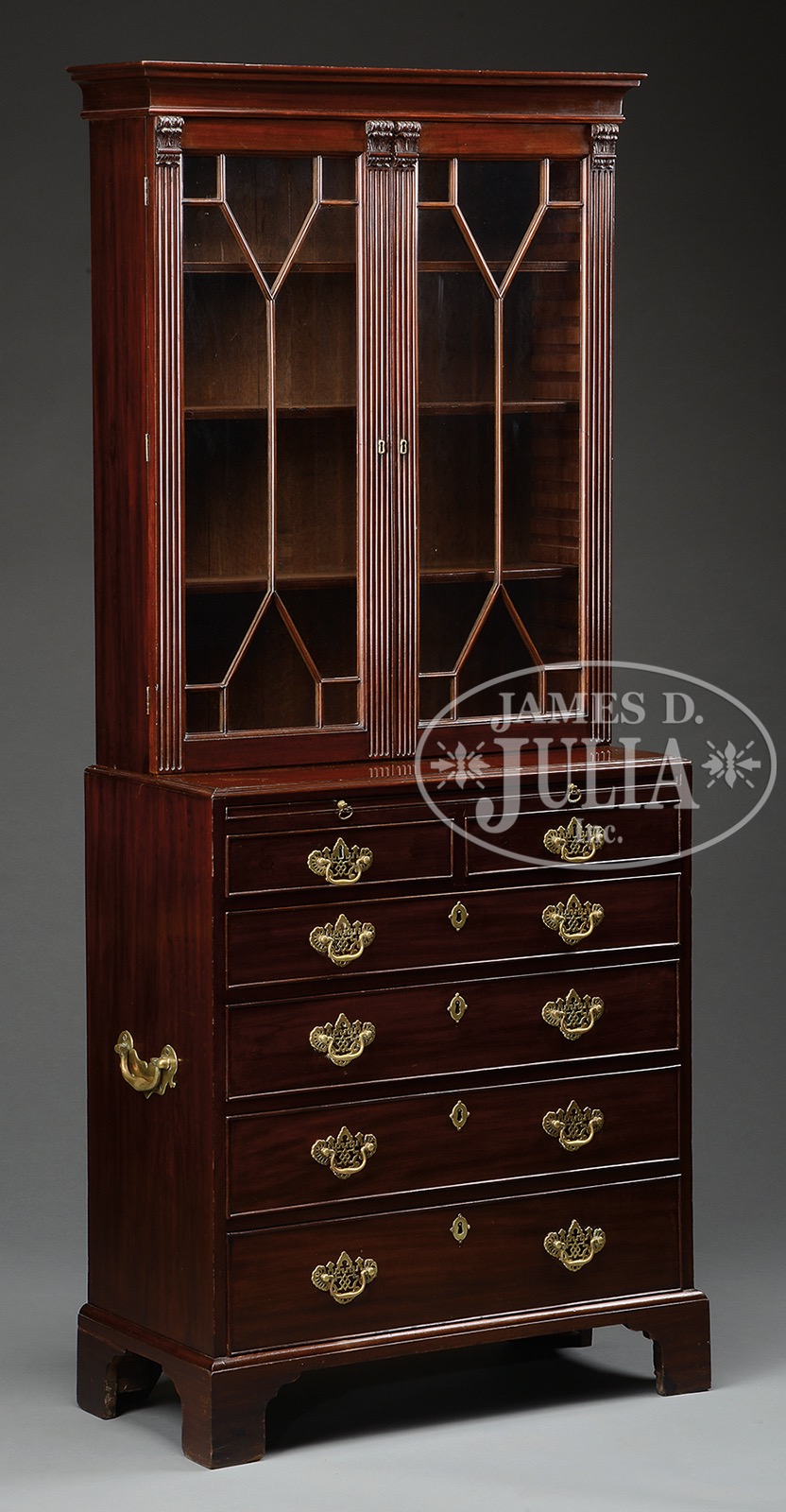 FINE DIMINUTIVE GEORGE III MAHOGANY SECRETAIRE BOOKCASE.Last quarter 18th century, England. In two parts, the upper case with molded cornice fitted with a pair of astragal glazed doors, each with eight glass panels. The pilasters in the form of engaged stylized fluted Ionic half columns. The interior fitted with three adjustable shelves, The bookcase set back on the lower case fitted with a brushing slide over a pair of aligned short drawers over a four graduated long drawers all with cockbeaded edges. The uppermost long drawer opening to an interior fitted with a baise-lined writing surface sliding open to reveal a storage well. The drawer additionally fitted with a well containing a pair of faceted glass inkwells and a double trough pen tray. The whole on a molded plinth raised on bracket feet with shaped returns. The lower case fitted with heavy brass carrying handles. The drawers with large pierced brasses of the period. SIZE: 77-1/2″ h x 32-1/2″ w of case x 34″ w overall x 15-1/2″ d. CONDITION: The secretary with original surface. Period brasses are replacements. Bracket base appears original as do backboards. Cabinet with rich dark patina. Very good overall. 51337-3 (2,000-3,000) – Lot 2173
