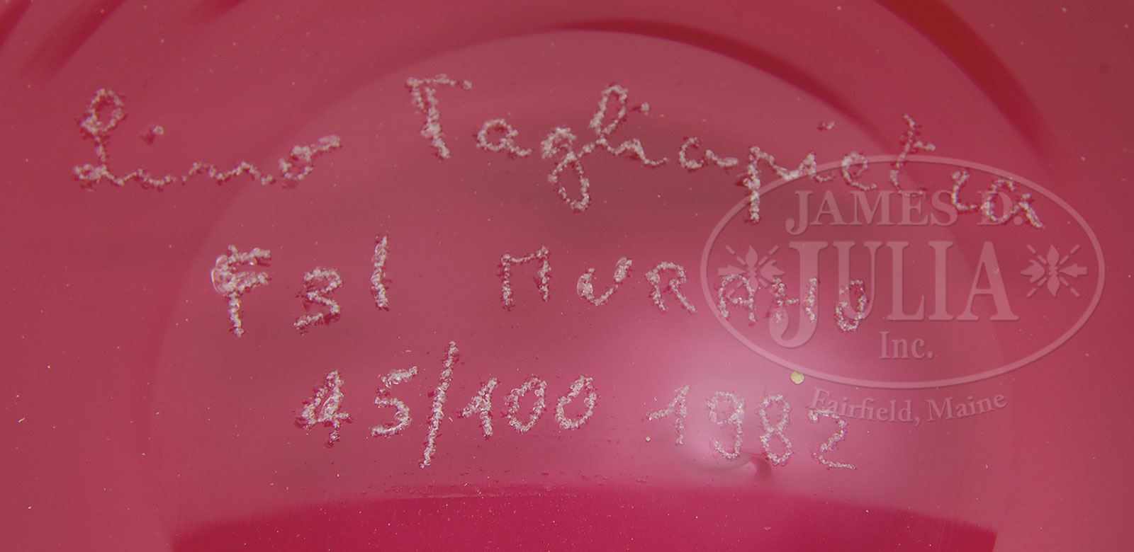 LINO TAGLIAPIETRA VASE.Large pink vase by famed Italian glass artist Lino Tagliapietra has shaded pink body and is finished at the top with an applied rolled collar. Signed on the underside with etched signature “Lino Tagliapietra F31 Murano 45/100 1982”. The vase also has original clear labels on the side. One “effetre international lavorato a mano-Murano, Italy”. Another of the tags reads “Vetri Murano” and the third tag reads “Oggetti”. SIZE: 11-1/2″ t. PROVENANCE: James Boma Collection. CONDITION: Very good to excellent. 5-69701 (1,500-2,500) – Lot 2175