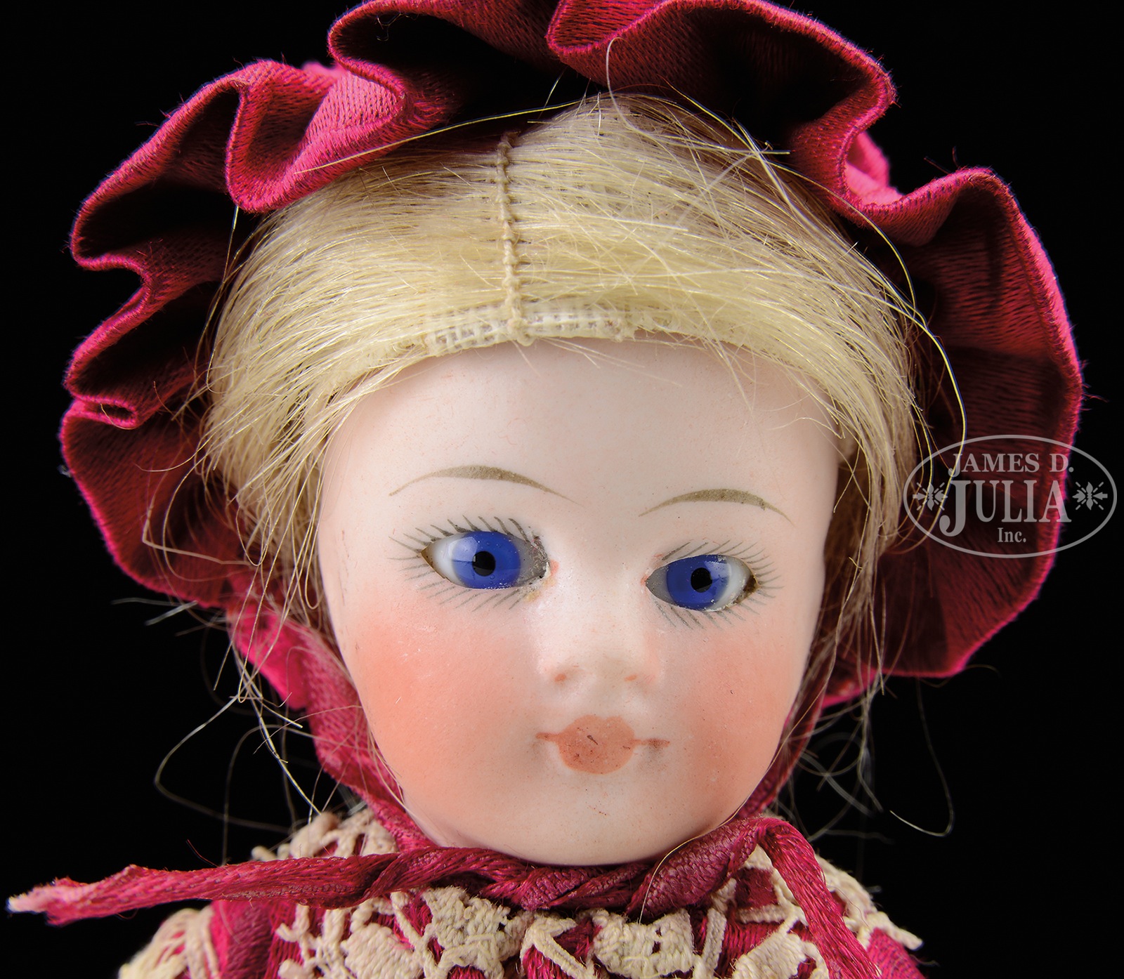 6″ SIMON & HALBIG ALL-BISQUE.A charming young lady with what appears to be in all original condition. Her elaborate dress and underwear along with her blond wig and blue eyes make quite a statement. Nice even bisque with good coloring and 1-stroke eyebrows, she has brown shoes with 2 straps and white stockings. Impossible to check for upper arm and upper leg bisque chips due to original clothing, but the head and neck socket show no issues. A great package and ready to put into your collection. SIZE: 6″ t. CONDITION: Silk dress is all original, however there is some deterioration fraying to the front panel. 48887-3 (800-1,200) – Lot 2176 Auction: Advertising, Toy & Doll - Spring 2015 Please Note: All prices include the hammer price plus the buyer’s premium, which is paid by the buyer as part of the purchase price. The prices noted here after the auction are considered unofficial and do not become official until after the 46th day. |