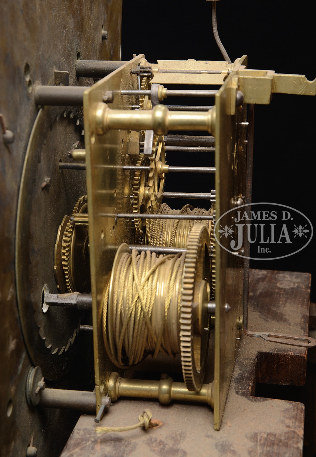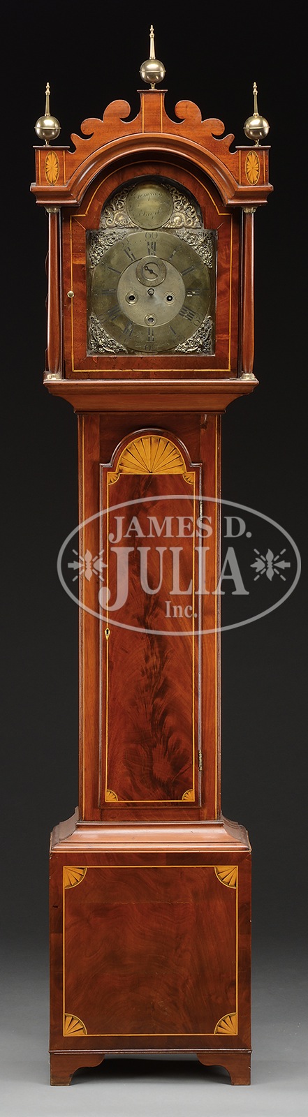 American or English, circa 1815. An inlaid mahogany tall case clock with eight-day time-and-strike movement. The bonnet having a scrolled solid fret with inlaid plinths and brass ball-and-spire finials. The inlaid arched bonnet door is flanked by free-standing columns with brass capitals and bases. The pendulum door has an arched top and semi-circular fan inlay, with quarter fans at corners, and string inlay and crotch mahogany veneer. The door is flanked by simple line inlay and beaded case sides. The lower case has cross banded crotch mahogany and line inlay, with quarter fan corners, and bracket feet. The movement is of composite construction, with brass sheet and applied cast spandrels, boss, Roman numerals and chapter ring, with an eight-day time-and-strike, with subsidiary seconds dial and date aperture. No hands are present. Signed “Benj. Morris / Deptford”. The dial has an add-on top portion with a boss in the arch that says “Tempest Fugit”. SIZE: 95″ h x 19-1/4″ w x 10″ d. CONDITION: Dial and movement associated with clock. Feet and finials have been replaced. Some age cracks to veneer in lower case. Quality refinish. 49191-31 (1,500-2,500) – Lot 2176