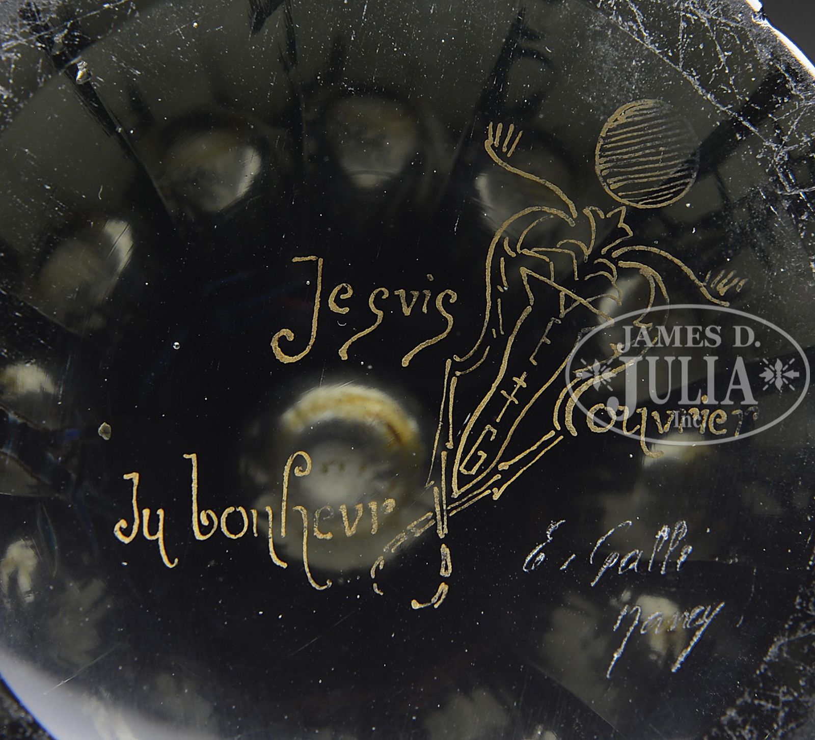 EARLY GALLE ENAMELED VASE.Early Galle vase has faceted bottom and slightly flaring top in smoky brown glass. Vase is decorated with heavily enameled plants with blue and green leaves extending up the front of the vase with a flying grasshopper above. Vase is signed on the underside “E. Galle Nancy” along with a stylized insect with initials “EG” concealed in the body as well as “Jesvis ouvrier Jy bonhevr”. SIZE: 11-1/2″ t. CONDITION: Some very minor fleabites and two small flakes to facet edges at foot. Otherwise very good. 7-70607 (1,500-2,000) – Lot 2177