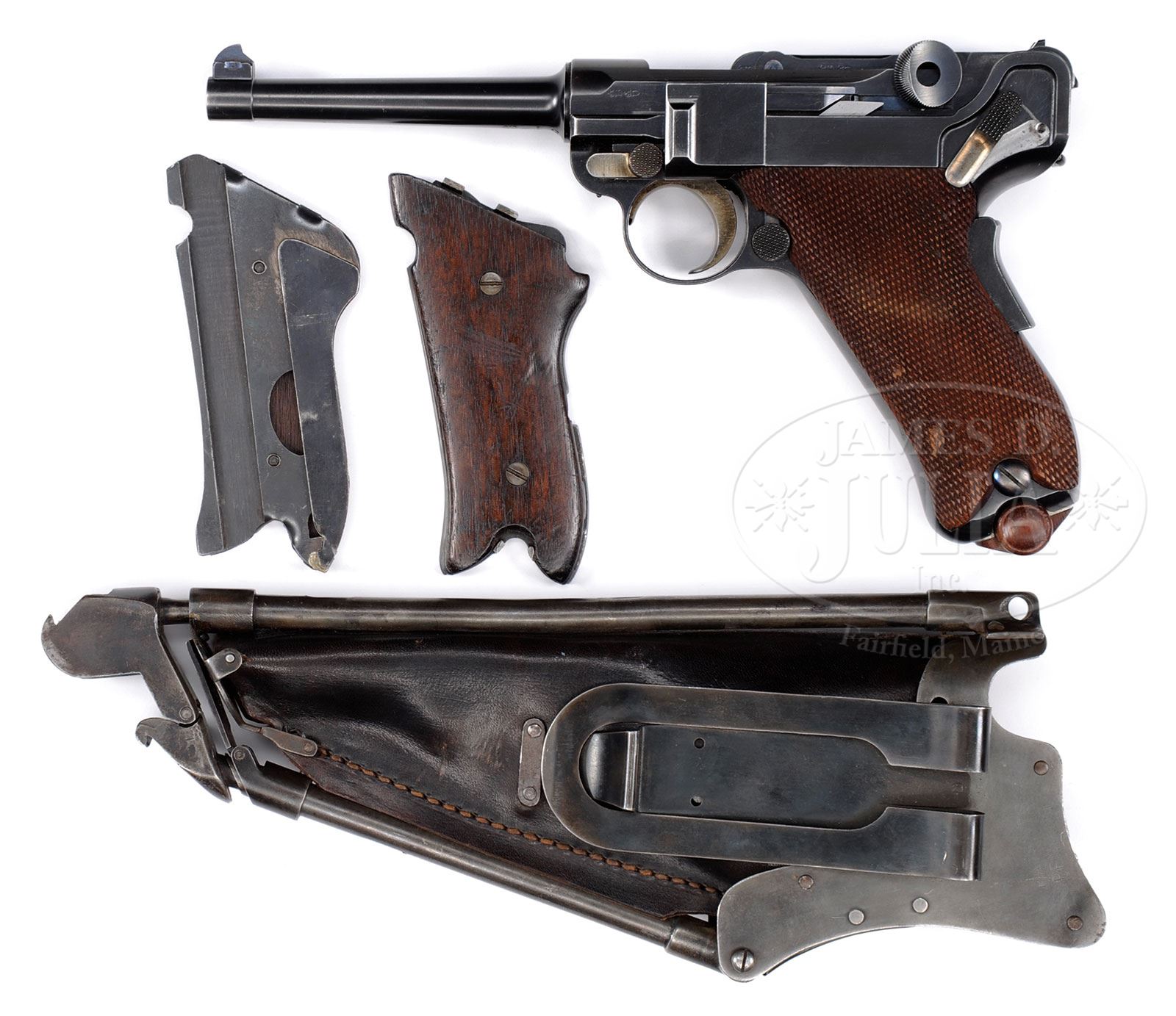 *SPECTACULAR EARLY MODEL 1900 COMMERCIAL LUGER PISTOL WITH IDEAL GRIPS AND HOLSTER.SN 4367. Cal. 30 Luger. Rare early variation with 4-3/4″ bbl and orig front sight. Chamber area over the receiver is unmarked and the toggle link has the intertwined “DWM” trademark. Pistol has its orig narrow grip safety, orig flat thumb safety and orig narrow trigger. Breech block has the orig, unmarked, flat extractor with dished toggle and the old model toggle lock. Area under the safety is polished bright. Bottom of bbl, left side of receiver, breech block and front toggle have “BU” proofs. Bottom front of frame is marked “GERMANY”. Mounted with full checkered walnut grips matching numbered to this pistol. Accompanied by one orig, unmarked wood base magazine. Also accompanied by a set of Ideal grips and an orig steel & leather Ideal holster with collapsible stock. Leather part of the rig may be a replacement. According to Lugers at Random, Kenyon, there were approximately 5,500 of these pistols produced. In another publication Luger: The Multi-National Pistol, Kenyon, he states that they were produced 1900-1905 in the serial range 01 to 19,000. Given the low SN of this pistol it seems likely that it was manufactured in the first year or so of production. According to Luger Variations Vol. 1, Jones, reports that the serial range extended to 21,220 and that there were 6-8,000 manufactured in three variations, including straight commercial Swiss & American Eagle.Regardless these early Luger pistols are almost never found in orig configuration with many of them having been altered with the 1902 improvements. CONDITION: Extremely fine plus, all matching except firing pin which is unnumbered. Overall retains about 98% crisp orig blue with only faint muzzle edge wear and very fine, light sharp edge wear on the receiver & frame. Breech block and toggle system retain virtually all of their orig blue. Strawed parts retain most of their orig straw colors, moderately faded on face of trigger. Left grip has a small gouge and a bruise, otherwise grips are sound showing only light diamond point wear with a few chipped diamonds and very little hand oil staining with some wood grain showing through. Mechanics are crisp; brilliant shiny bore. Magazine is equally new. Ideal grips show nicks & scratches with a few bruises and retain a hand worn patina. Holster is missing a couple of small rivets with two other replaced rivets and also is missing a screw from the top extension tube, otherwise holster & frame are sound. Leather retains strong black finish shows no use. Steel frame retains a blue grey patina with strong blue on the belt clip. 4-56074 (5,000-8,000) – Lot 2177