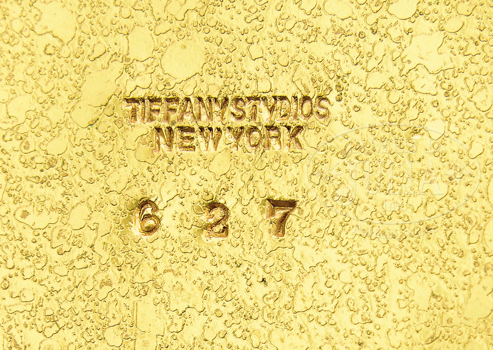 TIFFANY STUDIOS POLYCHROME LAMP BASE.Tiffany Studios lamp base has round stepped foot with ribbed design on each step with tall slightly bulging body and rounded shoulder impressed with stylized palm tree design repeating itself four times around base. Slender riser supports four socket cluster. Lamp is complete with replacement stamped heat cap. Base is finished in gold dore patina, while palm trees and ribbed decoration are polychromed in orange, blue and green. Signed on underside “Tiffany Studios New York 627”. SIZE: 23-1/2″ t. CONDITION: Very good to excellent with some wear to polychrome and some minor wear and discoloration to patina. Re-wired with appropriate cloth cord. 50441-2 (4,000-5,000) – Lot 2177