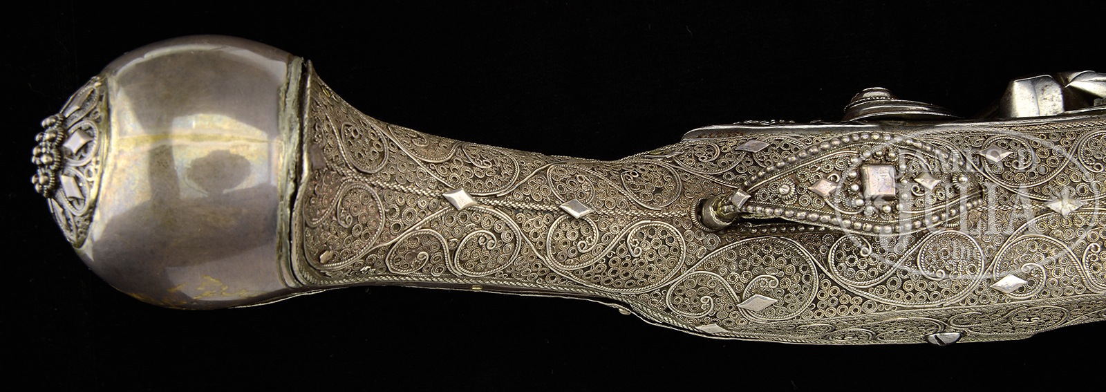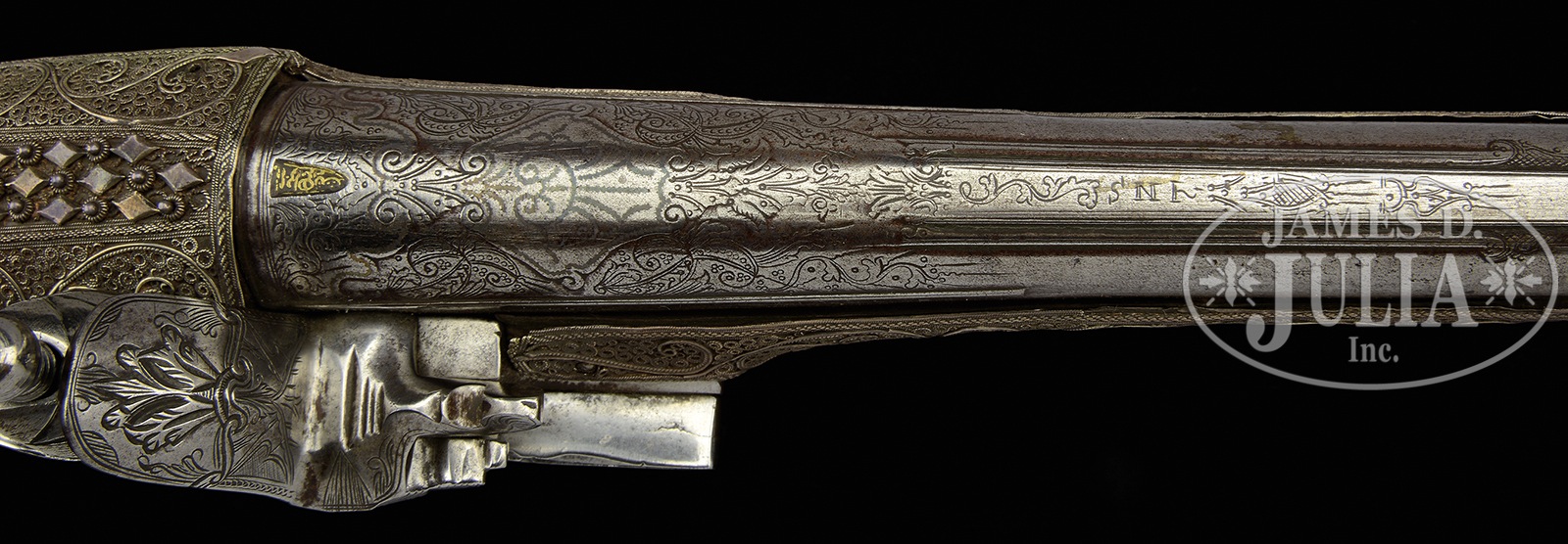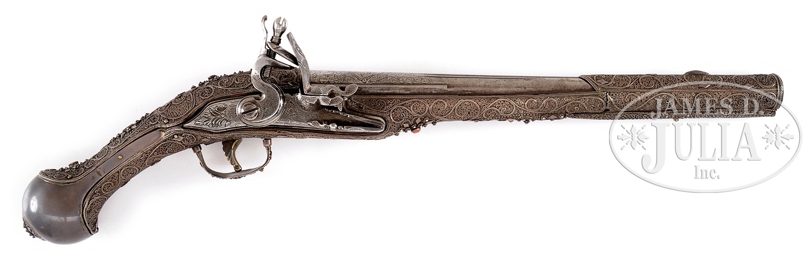 SILVER AND CORAL MOUNTED OTTOMAN FLINTLOCK PISTOL.SN NSN. Cal. 61. Impressive circa 1810 Ottoman flintlock pistol with 12″ bbl which is engraved, proofed and marked “ELAZARINO” with Ottoman marks and engraving. Other than about 8″ of bbl and lock, pistol is totally covered with fine silver filigree, with 3 red coral cabochons and sheet silver buttcap with similarly filigree decorated buttcap. CONDITION: Very good overall. Filigree work is 99% intact. Engraving on bbl worn but all discernible. Chiseled engraving on lock and hammer. Lock, cock and frizzen all polished bright. Mechanically functional with smooth bore with pitting. 50702-1 JS (2,500-4,000) – Lot 2178