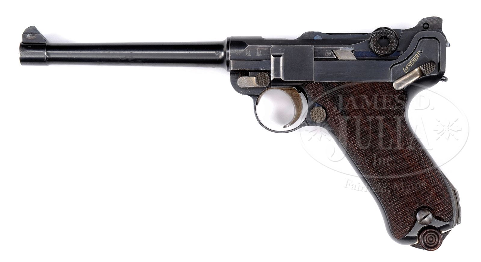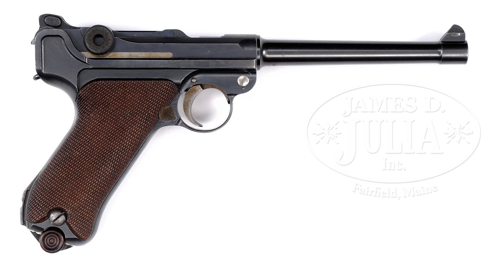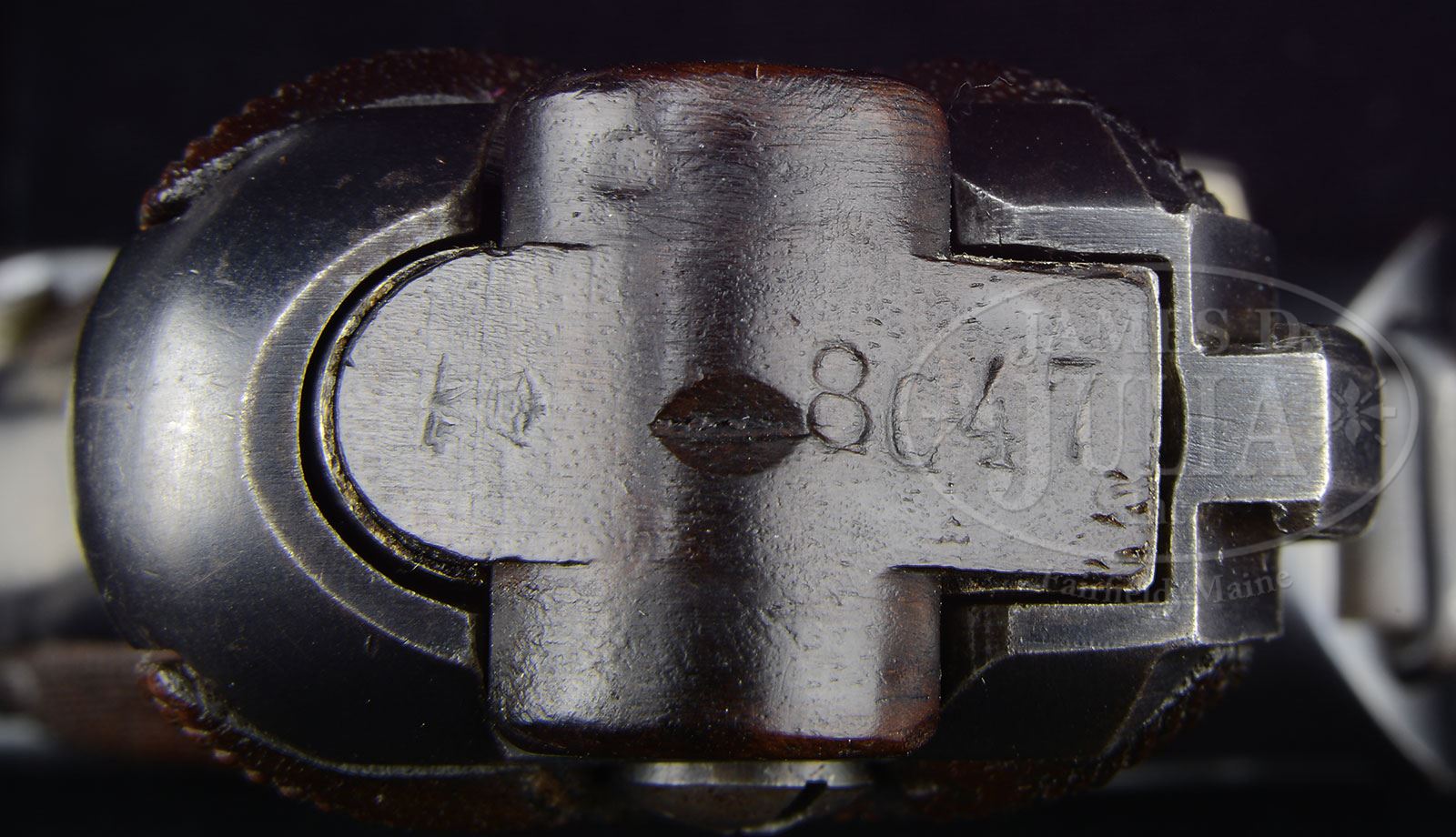 SN 8047b. Cal. 9 mm. Usual configuration with 6″ tapered rnd bbl and orig front sight on a pedestal. Chamber area of the receiver is unmarked and the toggle link is marked with the intertwined “DWM” trademark. Rear link has the 100-200 meter sight. Left side of receiver has dbl crown “M” proofs and a crown proof. Mounted with full checkered walnut grips, matching numbered to this pistol. Grips show fine wood grain with very little oil staining. Accompanied by one orig matching numbered wood base Navy magazine with concentric circles in the finger recesses. Although this model was manufactured in fairly high numbers, very few survive today in any configuration with a large percentage of them having been lost at sea or converted post WWI after the Treaty of Versailles. CONDITION: Extremely fine, all matching except firing pin which is unnumbered. Overall retains about 98% crisp orig blue with light muzzle end wear, some faint edge wear on the receiver & frame; left front edge of the frame has some light dimples which are also on the face of the lock bolt. Grips are extremely fine showing light diamond point wear, a little more pronounced on the right side. Small parts retain most of their orig straw colors, lightly faded on the thumb safety & lock bolt. Mechanics are crisp, bright shiny bore with some light frosting. Magazine is equally fine with a small notch cut in the bottom. 4-56128 (5,000-7,500) – Lot 2180