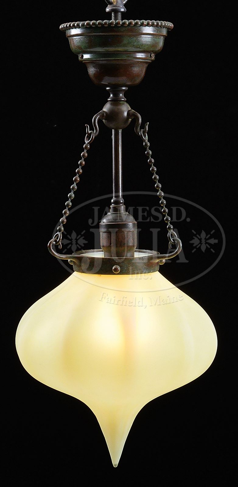 EARLY TIFFANY HANGING LAMP.Early Tiffany hanger has bulbous ribbed shade coming to peak at bottom with white slightly opalescent ribs against yellow pastel background. Shade is housed in bronze collar with incorporated hooks and is suspended from bronze ball chains which attach to Viking ball at ceiling cap with slender bronze stem supporting single socket. Hardware is finished in rich brown patina with green and red highlights. Unsigned. SIZE: Shade is 8″ dia. Lamp is approx 18″ from ceiling to tip of shade. CONDITION: Very good to excellent. 50398-12 (2,500-3,500) – Lot 2180