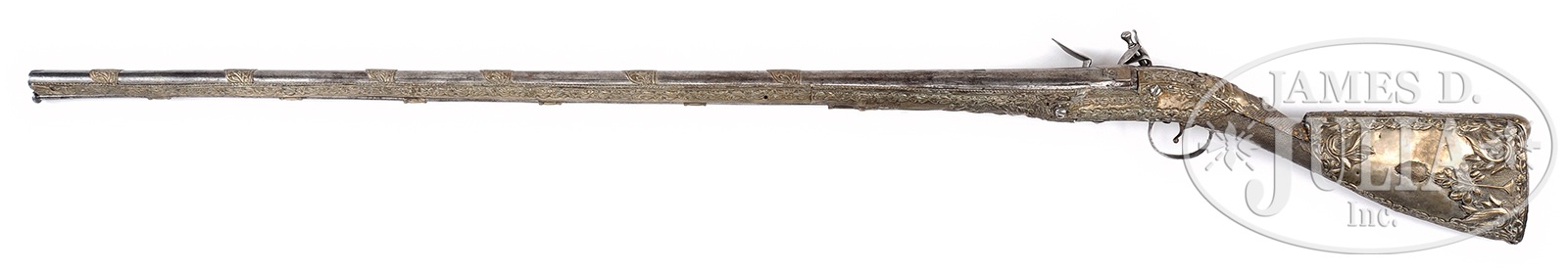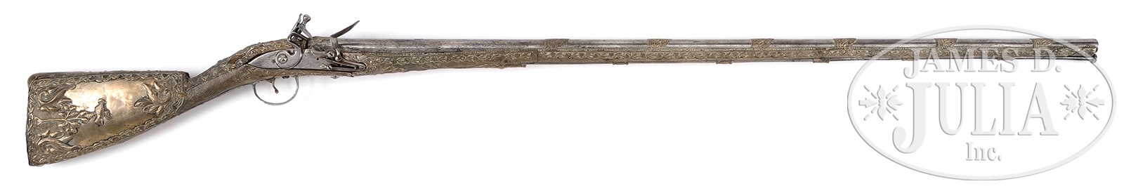 Please Note: Great News! Accompanied by a large display case. RICHLY DECORATED OTTOMAN FLINTLOCK RIFLE.SN NSN. Cal. 65. 55″ overall with a 40″ tapered bbl with entirety of stock covered in silver plated brass sheathing attached with iron and decorative brass pins. 6 bbl bands decorated in-suite. Sheathing is all repousse with floral designs with large panels on buttstocks of bird atop a tree and another of the same kind of interesting tree with fruit. This is an interesting early 19th century musket with iron ramrod. CONDITION: Broken just forward of trigger guard with very old soldered repair in sheathing, wood broken beneath, 20-30% orig silver plate in protected areas, specially on buttstock, otherwise light mustard patina. Iron is cleaned, overall grey/bright, with European lock maker and bbl proofs partially discernible. Mechanically, lock functions with clear bore. 50702-2 JS (4,000-7,000) – Lot 2180