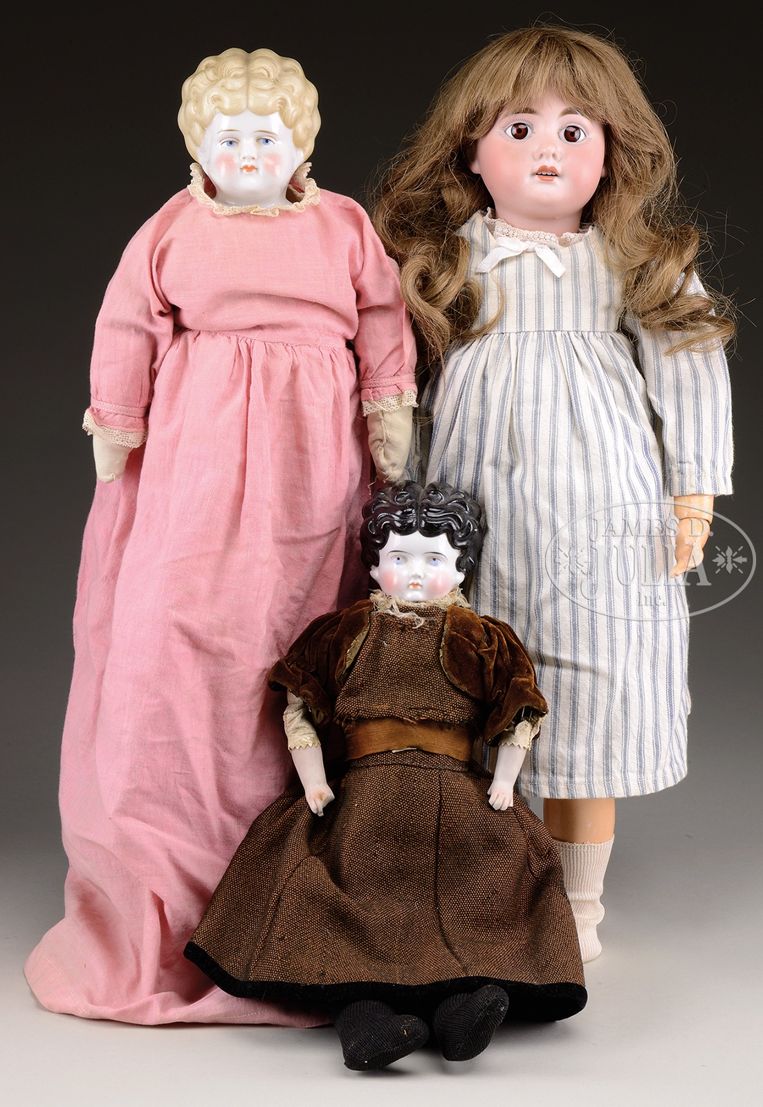 MISCELLANEOUS LOT OF 3 DOLLS.Lot includes 22” Armand Marseille 1894 German bisque doll with brown stationary eyes, open mouth with four teeth and replacement brown wig. On cloth torso with wood and composition limbs with original finish and jointed wrists. Also includes 17” black haired china with blue eyes on leather body and a 23” blond haired china impressed “Marion” across the chest. On replacement cloth body. SIZE: As stated above. CONDITION: Heads are good. Black haired china has some wear to hair and several broken fingers. 48784-1 (300-500) – Lot 2182 Auction: Advertising, Toy & Doll - Spring 2015 Please Note: All prices include the hammer price plus the buyer’s premium, which is paid by the buyer as part of the purchase price. The prices noted here after the auction are considered unofficial and do not become official until after the 46th day. |