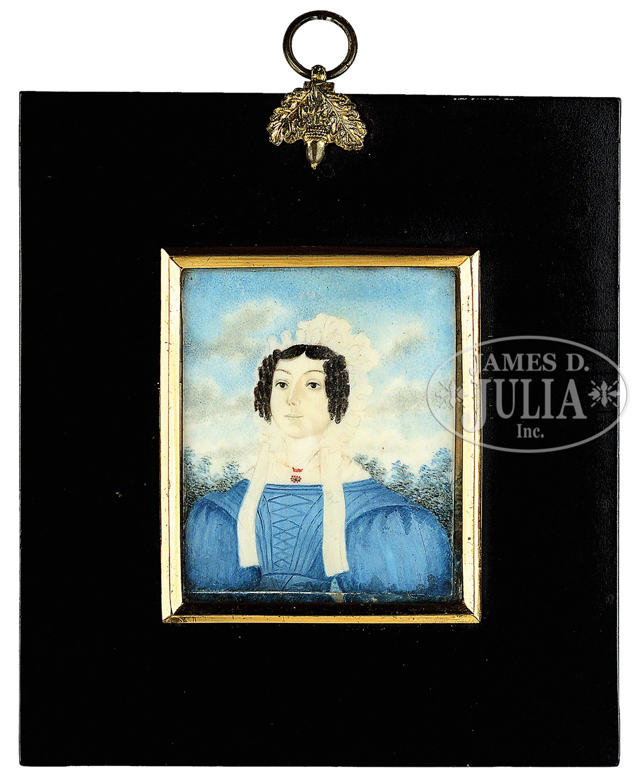 ENGLISH SCHOOL (19th Century) MINIATURE WATERCOLOR PORTRAIT ON IVORY OF ANN BABER.In original frame. The young Mrs. Baber is wearing a blue dress and white bonnet with tight black pin curls framing her face. She is set in a landscape of trees with a sky dotted with puffy gray and white clouds. Unsigned, with a label on the back inscribed “Ann Baber, wife of Benjamin Baber.” The back of the frame has an indiscernible English stamp with crown. NOTE: Geneological records list a Benjamin and Ann (Hopkins) Baber from Somerset, England were married in May of 1845. SIZE: 3-1/2″ x 2-7/8″. Overall: 7″ x 6-1/4″. CONDITION: Very good, no sign of cracks. 49861-11 (1,000-1,200) – Lot 2182