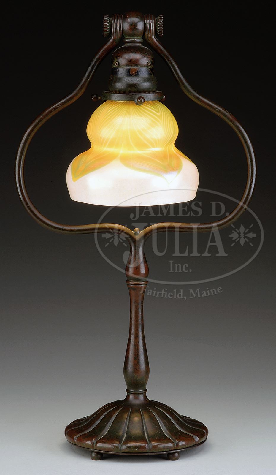 TIFFANY STUDIOS DESK LAMP.Tiffany Studios desk lamp has vertically ribbed round platform atop five bronze ball feet which supports simple stem leading to bronze harp which houses single socket and shade holder. Signed on underside “Tiffany Studios New York 419”. Lamp is complete with Tiffany favrile glass shade with green pulled feather design descending from fitter, each pulled feather is outlined in gold iridescence all against cream colored lightly iridescent background. Interior of shade is finished in bright gold iridescence. Signed in fitter “L.C.T.” SIZE: Shade is 5″ dia. Lamp is 17″ t. PROVENANCE: From the Unreserved Estate of the late David Barnett. CONDITION: Base is very good to excellent with minor wear and discoloration to patina, replacement switch, missing one ball foot. Re-wired with contemporary plastic cord. Shade is very good to excellent. 50444-33 (1,500-2,000) – Lot 2182
