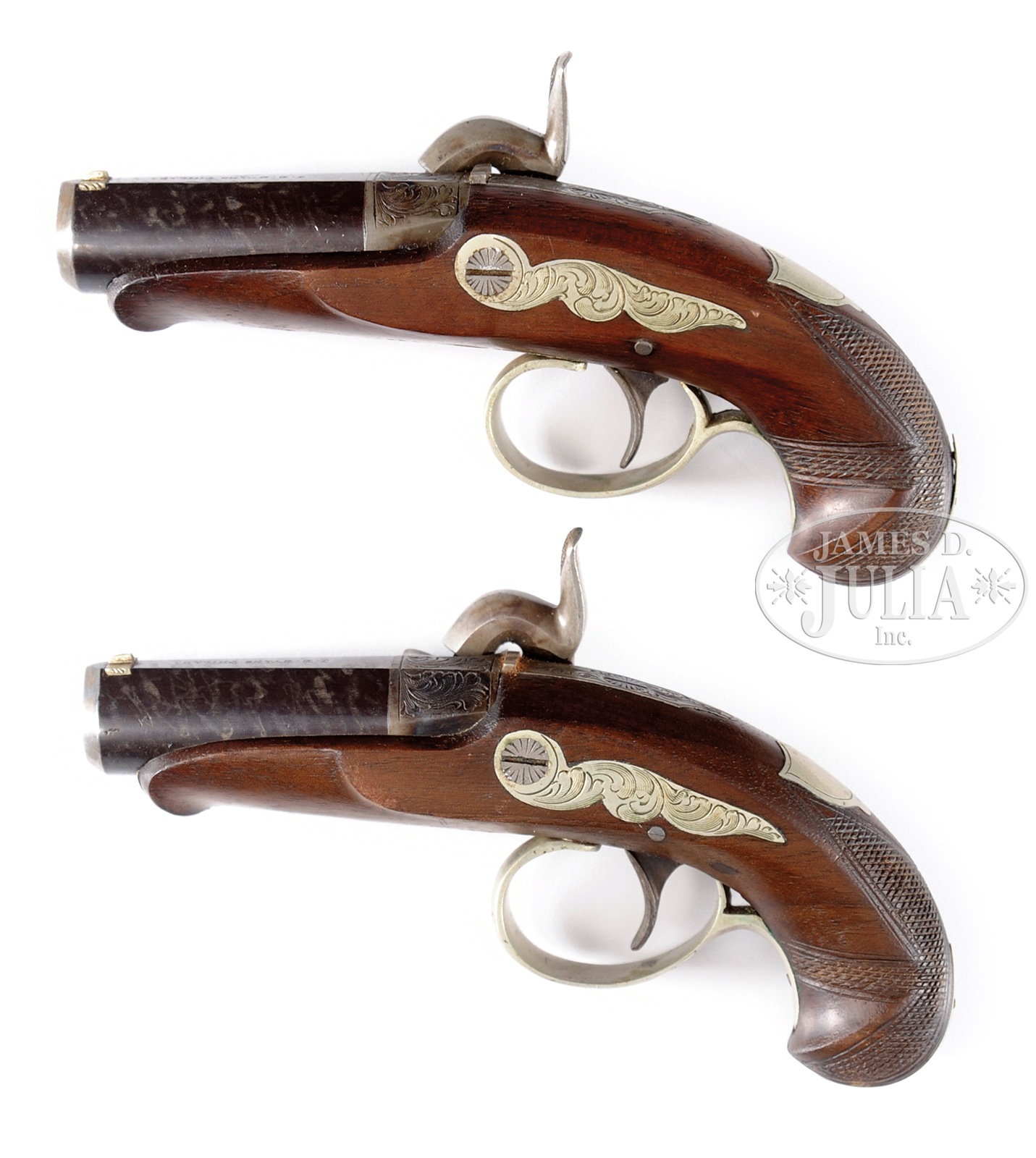 SPECTACULAR CASED PAIR OF J.E. EVANS PHILADELPHIA, DERRINGERS.SN NSN. Cal. 35. 2-1/2″ bbls. Diminutive “Peanut” size Derringer pistols with fine walnut stocks and finely embellished nickel silver mounts. Case colored back action percussion locks with matching hand engraved embellishment. Iron bbls with rich damascene pattern. Fitted with matching engraved/case colored breeches and tangs. Nickel silver front sights, forend tips and stock shields. Housed in a superb fitted period casing with brown velvet lining. CONDITION: Extraordinary near new condition. Iron bbls show no distress and retain most all of their most beautiful damascene finish. Case colored locks and breeches are wonderfully engraved and retain virtually all of their brilliant colors and finish. Nickel silver trigger guards and grip caps are superbly engraved in matching fashion and have attained a wonderful mellow aged coloring. Both pistols are marked identically “J.E. Evans Philad”. Fitted casing is in superb condition with only the slightest touch of wear to velvet lining with slight discoloration from age, exterior and all sides are excellent and in a state of great preservation. 50541-4 TDW (4,500-7,500) – Lot 2182