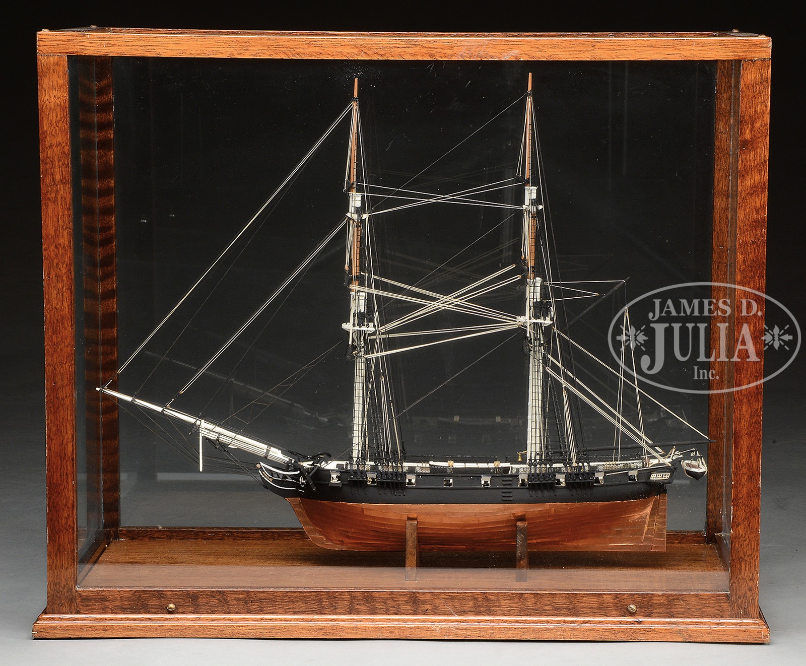 CASED SHIP MODEL OF A BRIG OF 20 GUNS.Late 20th century. Nicely carved and painted. Mounted with 20 cannon. A dory secured mid-ship. A second dory mounted to stern. Hull is copper clad below waterline. Mounted in custom mahogany display case. SIZE: 22″ h x 25-3/4″ l x 22-1/2″ w PROVENANCE: From a private Massachusetts collection. CONDITION: Very good overall. Nicely detailed model in very fine condition. 50800-131 (1,000-2,000) – Lot 2183