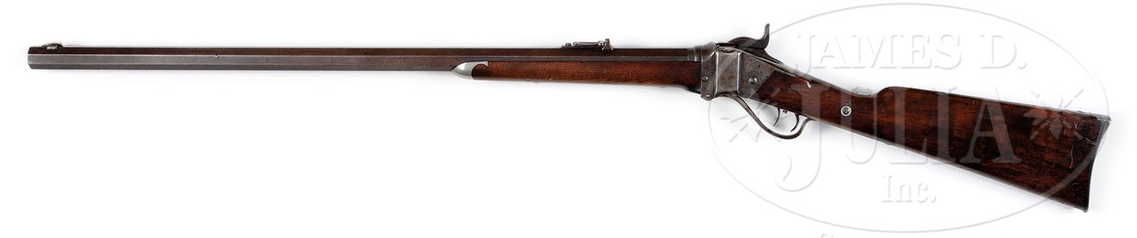 RARE SHARPS SPORTING RIFLE BUFFALO GUN SHIPPED TO LEAVENWORTH KANSAS.SN C53254. Cal. 50 (appears to be 50-70). Standard sporting rifle with 30″ med weight oct bbl, nickel silver Rocky Mountain front sight and Lawrence patent Sharps ladder rear sight. Top bbl flat is marked with the 2-line Hartford address forward of the rear sight and with cal marking diagonally over the chamber area. Chamber area also has a tiny “30”. Mounted with uncheckered, straight grain American walnut with pewter tip rnd Sharps forearm and straight stock with smooth steel Sharps buttplate. Top tang has the tang sight screw holes plugged. Accompanied by a Sharps factory records letter which identifies this rifle as having been invoiced at the Hartford factory on Nov. 23, 1872 to J.F. Schmelzer of Leavenworth Kansas. It is described as having a 30″ oct bbl, in cal 50, double triggers, globe & peep sights, and oil finished stocks. Letter states that there were three identical rifles shipped to the Schmelzer firm on the same day. The Schmelzer Co. was a supplier to buffalo hunters in Kansas, Nebraska and Texas, so there is little doubt that this rifle would have been on the front line of the buffalo hunts. The 50-70 cartridge was one of the more popular cartridges and was used throughout the entire short time frame of the buffalo hunts. This cartridge was no less popular than the 44-90 Sharps although it did not have the range of the smaller cartridge. Reading several accounts of shooting buffalo disclosed that most shots were taken from 200-600 yards and frequently even longer ranges where the 50 cal was less reliable. Documented true buffalo rifles shipped to the immediate area where the shoots took place are a great rarity. CONDITION: Very good, all matching including bbl, forearm, lockplate, trigger plate, buttstock & buttplate. Bbl retains strong blue under the forearm with the balance a light brown patina; receiver, lockplate, hammer, trigger plate & buttplate are mostly a grey/brown patina. Stock has a hairline around the top tang, otherwise wood is sound showing heavy wear, especially on the forearm and retains most of a very old restored finish. Hammer will not catch in safety notch, otherwise mechanics are fine; strong bore with fine pitting. 4-47913 JR131 (25,000-35,000) – Lot 2184 Click here to view provenance