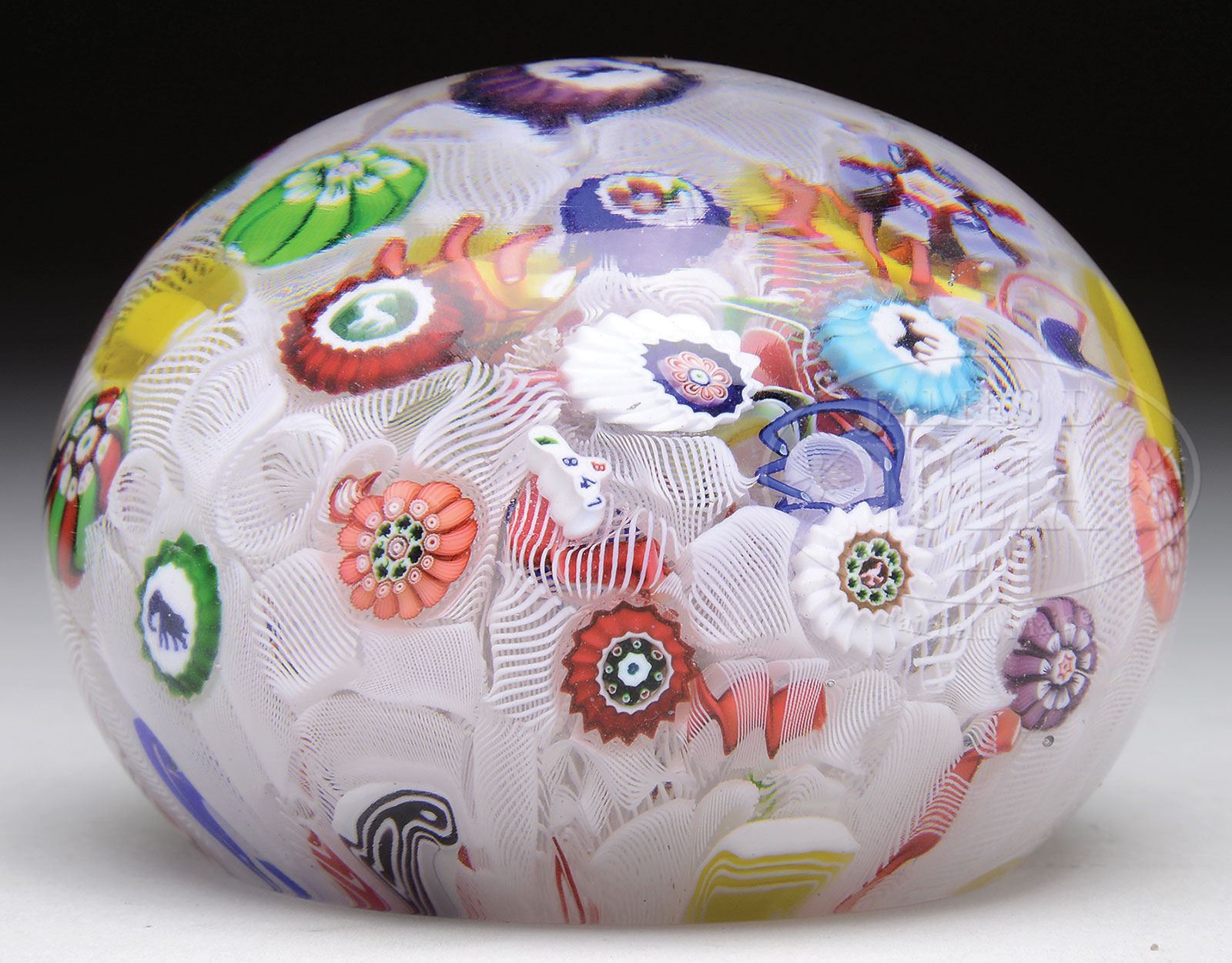 ANTIQUE BACCARAT FRANCE PAPERWEIGHT SIGNED 1847.Antique Baccarat, French paperweight having scattered millefiori with gridel animal canes; horse, goat, dog, monkey, elephant, partridge in addition a shamrock, and flower cane on upset white muslin. Signed in a cane “B1847”. SIZE: 3″ dia. CONDITION: Very good to excellent. 5-69589 (1,750-2,150) – Lot 2185