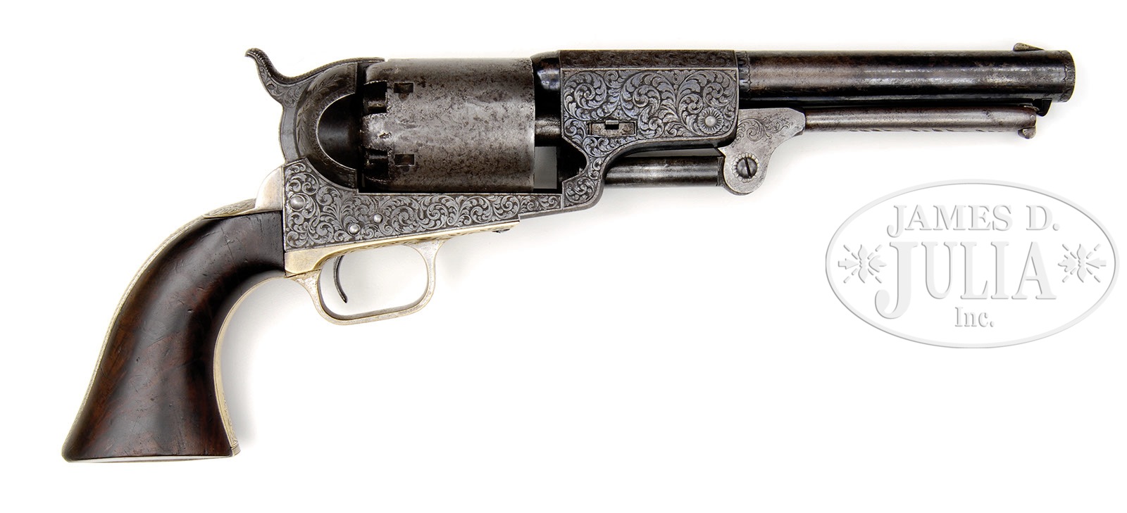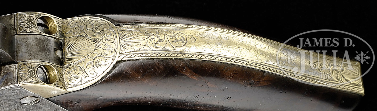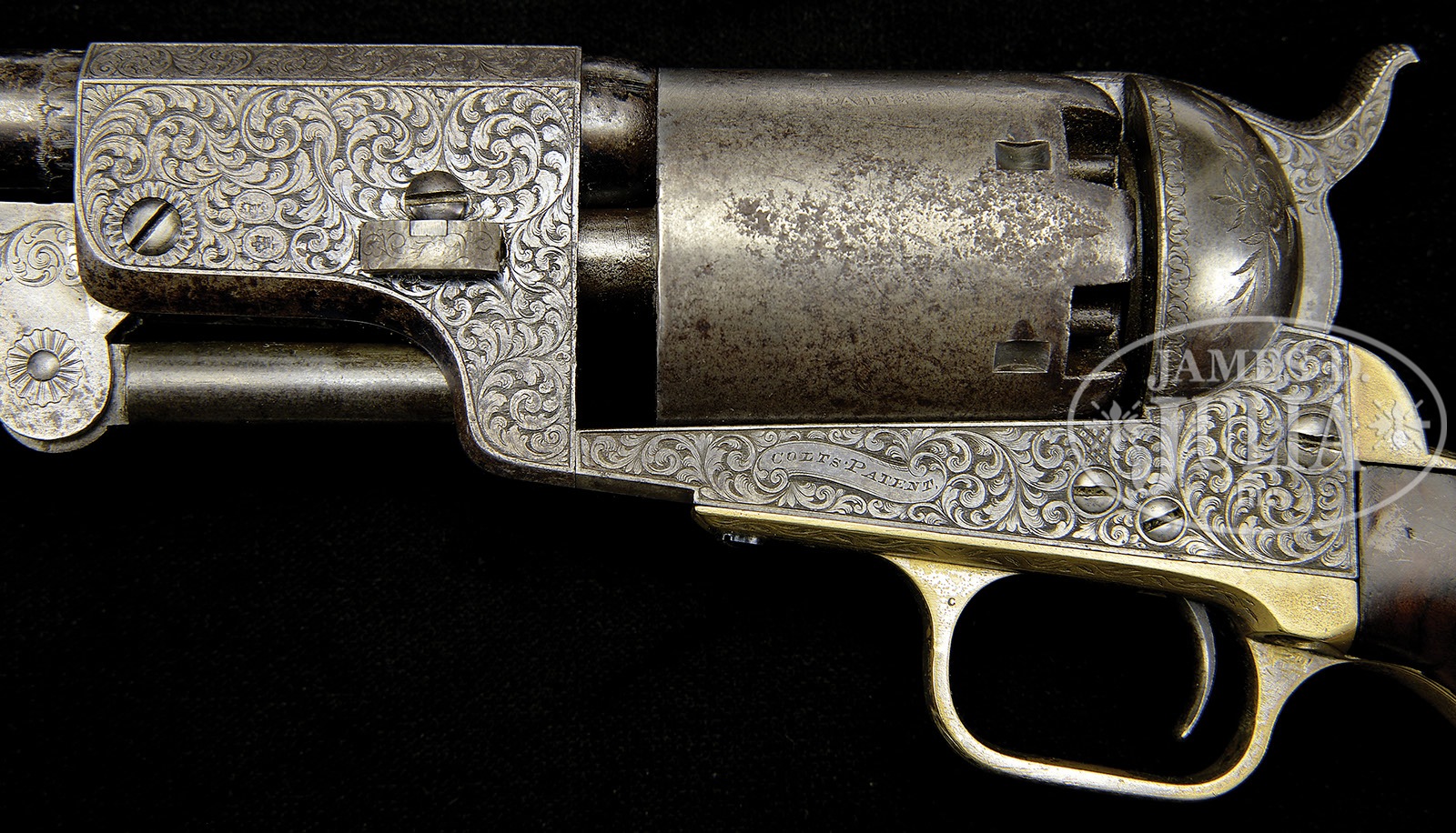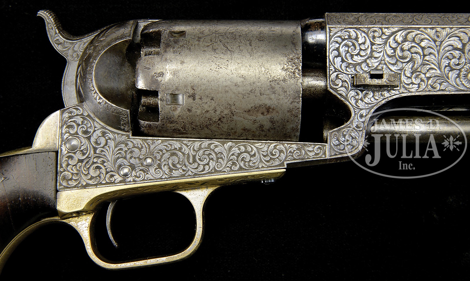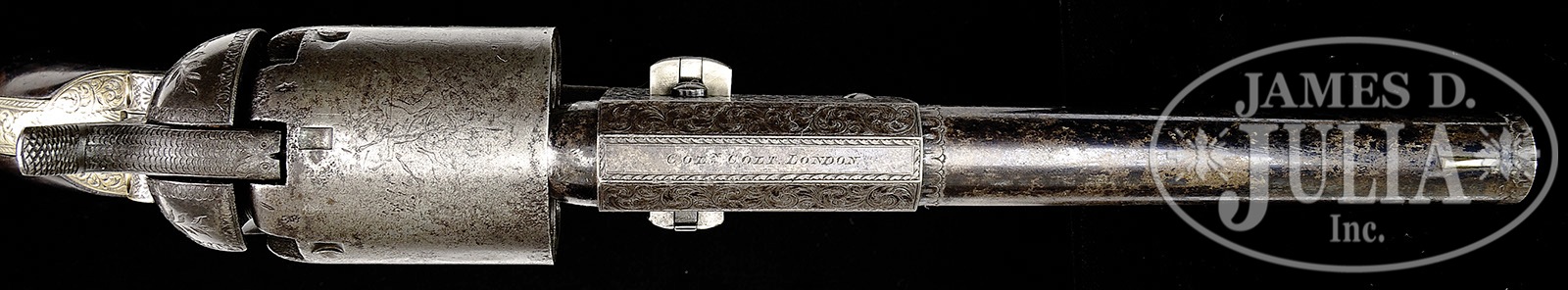 SCARCE MAHOGANY CASED DELUXE ENGRAVED COLT 3RD MODEL HARTFORD-LONDON DRAGOON.SN 18. Cal. 44. Cased & profusely engraved (one of only six known to be deluxe engraved) Hartford-London Dragoon SN 18 mfg ca. 1853. Blue & color case hardened with 7-1/2″ oct to rnd bbl, German silver front sight. Hand-engraved barrel address “COLN COLT. LONDON” reading from breech to muzzle (one of five known) and also hand-engraved “COLTS. PATENT.” within an unfurled banner on left side of the profusely engraved frame. It has usual 6-shot cyl with the Dragoon Indian fight scene roll marking and five of its six safety pins mostly serviceable. It has a silver-plated brass back-strap, small rounded silver-plated brass trigger-guard and select burl walnut one-piece grips. Loading lever entering from the right side of the loading lever assembly, no bevel on the cut-out, short trigger (one of nine recorded), vertical loading lever catch and stacked British proof-marks on the barrel. Frame has full coverage, wonderfully executed foliate arabesque patterns on sides with fine shaded background and foliate & floral engraving on recoil shields. Hammer is lightly engraved on sides of spur with dolphin motif on top edge. Bbl lug has full coverage foliate arabesque patterns with British proofs on sides and a nice border around the address on the top flat. There is a scalloped border on the bbl at the transition and around the muzzle. Top of backstrap has a wonderfully executed fan pattern with foliate arabesque patterns, a fine border pattern down the backstrap with engraving patterns at top & heel, also on buttstrap & trigger bow. Wedge & rammer are engraved to match. Wedge is unnumbered and rammer handle has the number “37”. Accompanied by a rare orig mahogany English casing with empty brass panel in the lid. It is blue velvet lined and compartmented in bottom for the revolver, a silver plated Sykes Patent bag flask, a brass 2-cavity “COLTS PATENT” bullet mold with steel sprue cutter, a Hawksley pewter oil bottle, an L-shaped nipple wrench/screwdriver, an all metal English cleaning rod and a rosewood screw-lid bits box containing one spare nipple. This exact revolver is pictured on p 148 of “Colt Engraving” by R.L. Wilson, and on p 234 of “The Colt Engraving Book” Vol.1 by R.L. Wilson and p 137 of “Colonel Colt London” by Joseph G. Rosa. Engraved dragoon revolvers are quite rare and cased examples are extremely rare. It has been estimated from collated research, that fewer than 10% of Hartford-London Dragoons were factory engraved and this one, with deluxe engraving, perhaps only 1% of the 700 produced. PROVENANCE: Arnold M. Chernoff Collection. Chester Bonoff Collection. Pete Holder Collection. Damien Scattizi Collection. CONDITION: Fine, all matching except wedge & grip. Bbl retains about 60% orig blue with the loss areas flaked to a medium patina; rammer handle is a gray/brown patina; frame retains dark case colors in sheltered areas being mostly a silver/brown patina; cyl is mostly a silver/brown patina with a large area of light pitting, some dents & dings around the front edge that were dressed out; two of the British proof marks on the cyl appear to have been double struck and overall retains about 25-30% Dragoon/Indian fight scene; trigger guard & backstrap retain 30-40% thin silver plating. Grip is sound, a little undersized for the frame and overall retains a smooth oil finish. Mechanics are fine, strong bright bore with scattered pitting. Case is sound with numerous handling & storage nicks & scratches and retains 80-85% orig varnish; interior is lightly to moderately faded with moderate soil in the bottom; flask retains most of its fine silver plating with bright blue spring; mold has a few light nicks & dings with fine cavities and a crisp light mustard patina; other accessories are fine. 4-51555 (30,000-40,000) – Lot 2188