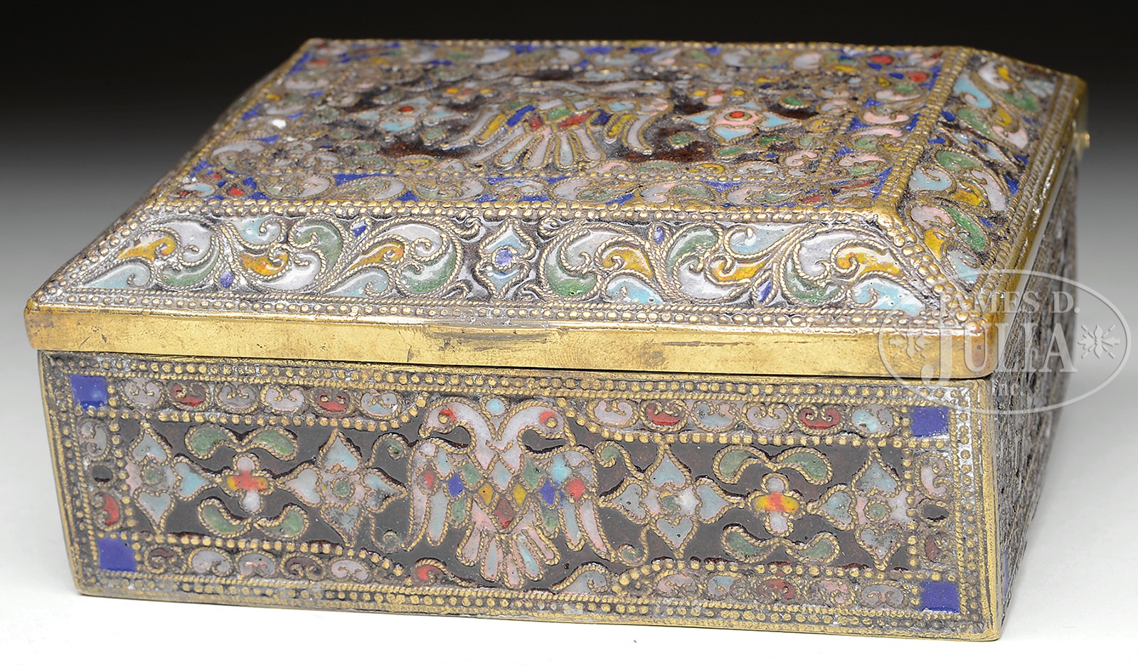 RUSSIAN ENAMEL JEWEL BOX WITH IMPERIAL EAGLE.Late 19th early 20th century, small brass casket with enameled decoration on all sides featuring Imperial Russian eagle on top and front. SIZE: 2″ t x 5″ x 3-1/2″. CONDITION: Very minor loss to enamel, small dent in base. 9-94425 (400-600) – Lot 2188