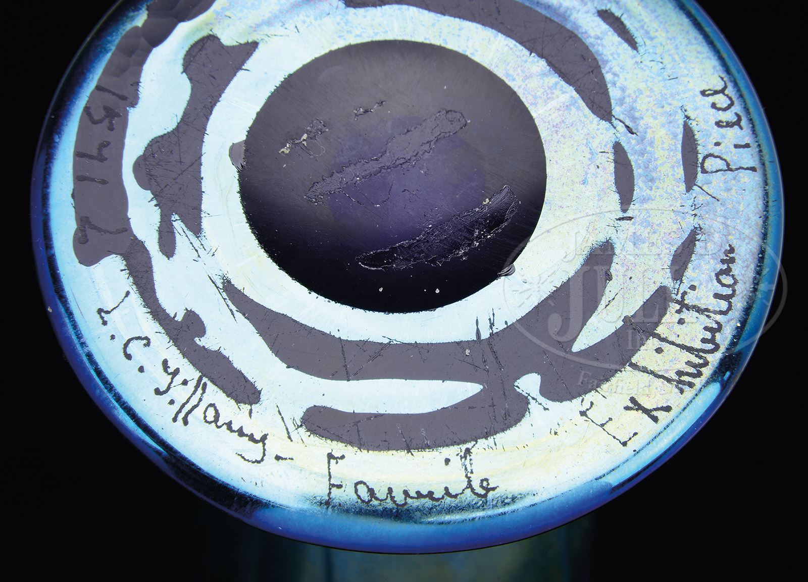 TIFFANY BLUE FAVRILE VASE.Tiffany flower form vase has tall ribbed body and is finished with bright iridescence shading from platinum at foot to purple at middle and gold at top. Vase is signed on underside “L.C. Tiffany-Favrile Exhibition Piece 1571L”. SIZE: 11-1/2″ t. CONDITION: Very good to excellent. 50280-5 (1,500-2,500) – Lot 2188