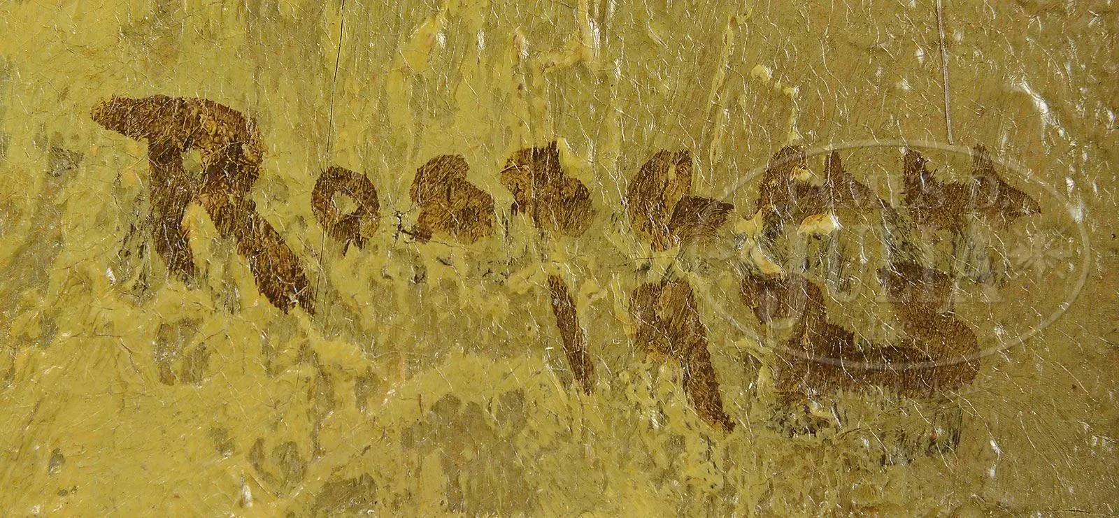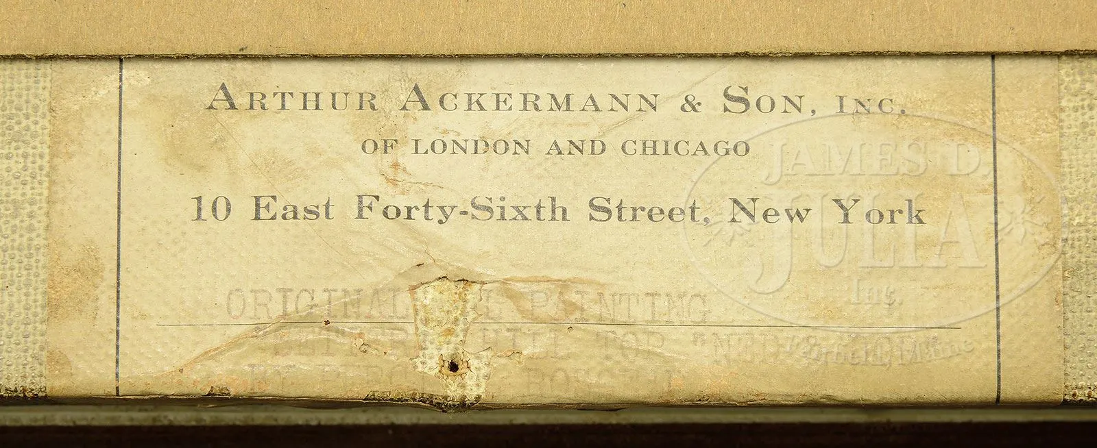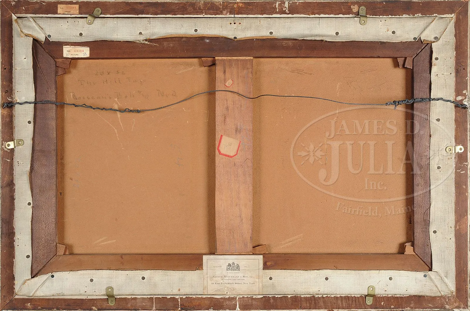 OIL ON CANVAS PAINTING BY PERCIVAL LEONARD ROSSEAU (American, 1859-1937) “SETTERS ON HILLTOP NED & BOB.”.Outstanding framed oil on canvas painting depicts two dogs on point in a grass covered hilltop landscape. The lead dog centered in the painting having flowing white coat. He stands still in pointing position looking right to left while another dog with white coat and black patches follows his lead. The foreground grass field leads to a background of a slight hillside with trees and colorful bushes. Signed lower right “Rosseau 1923.” Housed in a period gilt decorated frame. On reverse is an Arthur Ackermann & Son, Inc label which is attached to both the stretcher and frame. The label has type written artist and title. Also on reverse is an inset light board supporting the canvas which also has the artist and title. Percival Rosseau was born in 1859 in Pointe Coupee Parish, Louisiana. His training was at the Academie Julian in Paris, France starting in 1894 where he worked under Jules Lefebvre, Charles Herrmann-Leon and Tony Robert-Fleury. It was in the Paris salon that he initiated his start in painting sporting dogs and won much acclaim. Although he remained in France until 1915, he made several trips back to the United States to exhibit and fulfill commissions. With the onset of the first World War, he returned to the United States permanently and settled in Old Lyme Connecticut where he became part of the Old Lyme artists’ colony. It was at this time that he spent time at the estates of his wealthy patrons who invited him to shoot and paint on their properties; among these was Percy Rockefeller who lent Rosseau his dogs for use as models and even went to the extent of building a studio for him to use during the cold weather months at Overhills, his private hunting club in Fayetteville NC. Over the years Rosseau’s paintings would be made into fabulous sporting prints and collected by the general public. Arthur Ackermann & Sons was a very prestigious firm based in London and New York and considered to be one of the oldest art dealers in London. They were best known for the publication and selling of sporting prints as well as dealing in the original paintings. This painting was copyrighted by the firm in 1925. SIZE: 20″ x 32″ Overall including frame 23-1/2″ x 36″ PROVENANCE: Purchased from W.E. Browne & Co. (a copy of the invoice included dated 8-7-72) of Atlanta Georgia by Mr. Jack Adair who was with his wife personal friends of Robert Woodruff (Coca-Cola founder). Both men were members of the Augusta National Golf Club. The Adairs were guests at Mr. Woodruff’s plantation “Ichauway” in South Georgia where they enjoyed quail hunting. It is thought that through this connection and their love of sport shooting, that inspired the Adairs to buy this painting. After Jack’s death in 1974 the painting was inherited by Marisa Adair, who married Mr. Calvin R Allen, who inherited the painting when Marisa died in 1998, and they are coming to the market as part of his estate. CONDITION: Very good to excellent. 4-53770 WAG (20,000-40,000) – Lot 2188b Click here to view provenance