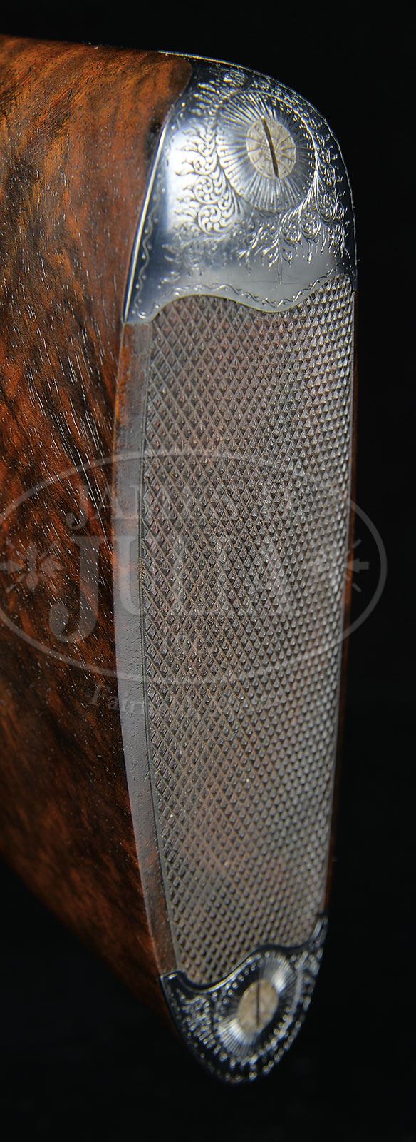 *EXCEPTIONALLY RARE AND SUBLIME BOSS .410 OVER-UNDER, SIDELOCK EJECTOR, SINGLE TRIGGER GAME GUN WITH CASE.SN 8855. (1952) Cal. .410. 3″ Chambers. 26″ Demi-bloc barrels are engraved “Boss & Co 41 Albemarle Street. Piccadilly. London. W.” on left side of top bbl, which is mounted with flat, matted, solid rib sporting Bradley red beads. Right side is stamped with London nitro proofs for 3″ chambers. Bbl flat is stamped with matching proofs. SN is on bottom of bottom bbl. Diminutive Boss low profile O/U action is fitted with back action sidelocks and incomparable Boss single trigger. Case hardened action is nicely filed and engraved in classic Boss house style of medium scroll and 14 rose bouquets. “Boss & Co” is on the front of each lockplate, and “Patent 3307-1909” (O/U gun) is engraved on each side of action. Single beaded trigger guard is scroll engraved and has another rose bouquet on small bow. SN is at grip. Beautifully marbled and elegantly flame figured European walnut straight grip buttstock has negative camber along toe line giving racy look. Butt is checkered and flanked by engraved steel heel and toe plates. Other features include classic drop points, point pattern checkering with mullered borders, and the initial “P” inlaid in gold on toe line. Small forend housing Boss’s unique ejector system, matches wood and checkering of butt, and has Anson type release. Bottom rear of iron is engraved “Boss’s Patent 3308-1909″ (ejector system). Bore diameter at muzzles: top -.398, bottom -.399. Minimum wall thickness: top-.032, bottom -.030. Drop at heel: 2-1/2″, drop at comb: 1-7/16″. Weight: 4 lbs. 15 oz. LOP: 14-1/2”. This lovely creation comes with its original leather case with stitched leather corners. Case is lined in scarlet cloth. Paper Boss label in lid has Dover Street address crossed out and Albemarle Street address stamped in. A second label gives instructions regarding ejectors. Case contains a pair of brass snap caps marked “Parker” “Made in England”, an H & H marked round oil bottle, and a 2-pc oak and brass cleaning rod, with mop, jag, Turk’s head, and lead remover in brown leather wallet. A horn handled small turnscrew and key are in covered compartment with brass knob. Accompanied by a copy of the original Boss ledger page for this gun order 12th May,1952 with specifications as observed. CONDITION: Exceptionally fine, as found, near new, showing scant evidence of handling and firing, with only a few very light handling marks on bbls. Nearly all damascening marks are on breech ends. Action retains nearly all of its orig case hardening color with slight silvering evident on beads, and on sharpest edges. Breech faces show only a hint of firing halos. Safety button retains over 60% orig bright blue, as do hinge pin covers. Trigger guard and top lever show only the slightest of silvering. Stocks retain essentially all of their lovely rubbed oil finish, with only a few minor pings and marks. Checkering shows only a hint of wear. Bores are excellent. Action is tight. Bbls are on face. Ejectors are strong and in time. Trigger works flawlessly. Case leather is excellent with only a few very minor marks. Straps and handle are very fine. Interior cloth is excellent with only a few slight rubs. Leather action guard shows some scuffs. Labels are slightly soiled and foxed. Accessories are fine. As well as being in an extraordinary state of preservation, this exceptional wand is also extremely rare. Dr. Ronald S. Gabriel in his book AMERICAN AND BRITISH .410 SHOTGUNS relates that he has studied the Boss records, and found only five .410 O/U’s before SN 10000. He further states that the 5th found was SN 10000 commissioned by an American dealer. A unique opportunity to own one of the finest and rarest British shotguns in existence. 4-51601 MGM76 (100,000-200,000) – Lot 2189 | Click here to view provenance