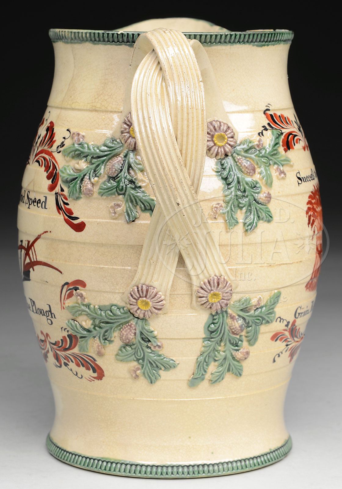 IMPORTANT POLYCHROME DECORATED LEEDS CREAMWARE JUG OF AMERICAN INTEREST. A large turned and clobbered creamware jug with 3 separate areas of notable decoration. The first and most significant is under the spout and reads “Let Not Liberty be Sold For Silver nor Gold Your Votes freely give To the brave & the Bold”. The decoration on the side includes a depiction of a plow and the words “God Speed the Plough”. The other side has a depiction of a sheaf of wheat and reads “Success to the Grain Return’d”. Of great significance is that the pallet used in the foliated decoration, as well as the plough and the wheat, is the same pallet used on the “Prosperity to the Province of Pennsylvania” teapot. The red parallels the decoration on the famous “No Stamp Act” teapot. The terminals of the strap handle have an applied floral decoration including what appears to be pine and pine cones. The coloration of the terminals is purple, green and yellow. The base and the rim are green. This form and pallet is known on various dated examples in the 1770’s. A coveted centerpiece for any 18th Century American historical ceramic collection. SIZE: 8-1/4″ h x 4-3/4″ w. CONDITION: Generally very good for its age. Strap handle is completely in tact and unbroken. Base is undamaged. The rim has several cracks emanating from the top downward. Cracks vary from 2-4″ and number approximately six. Some pieces have been glued back in. A tiny piece is missing. There has been some restoration work on the left of the spout and the tip of the spout. The piece is somewhat though lightly stained throughout. 9-91611 (10,000-25,000)