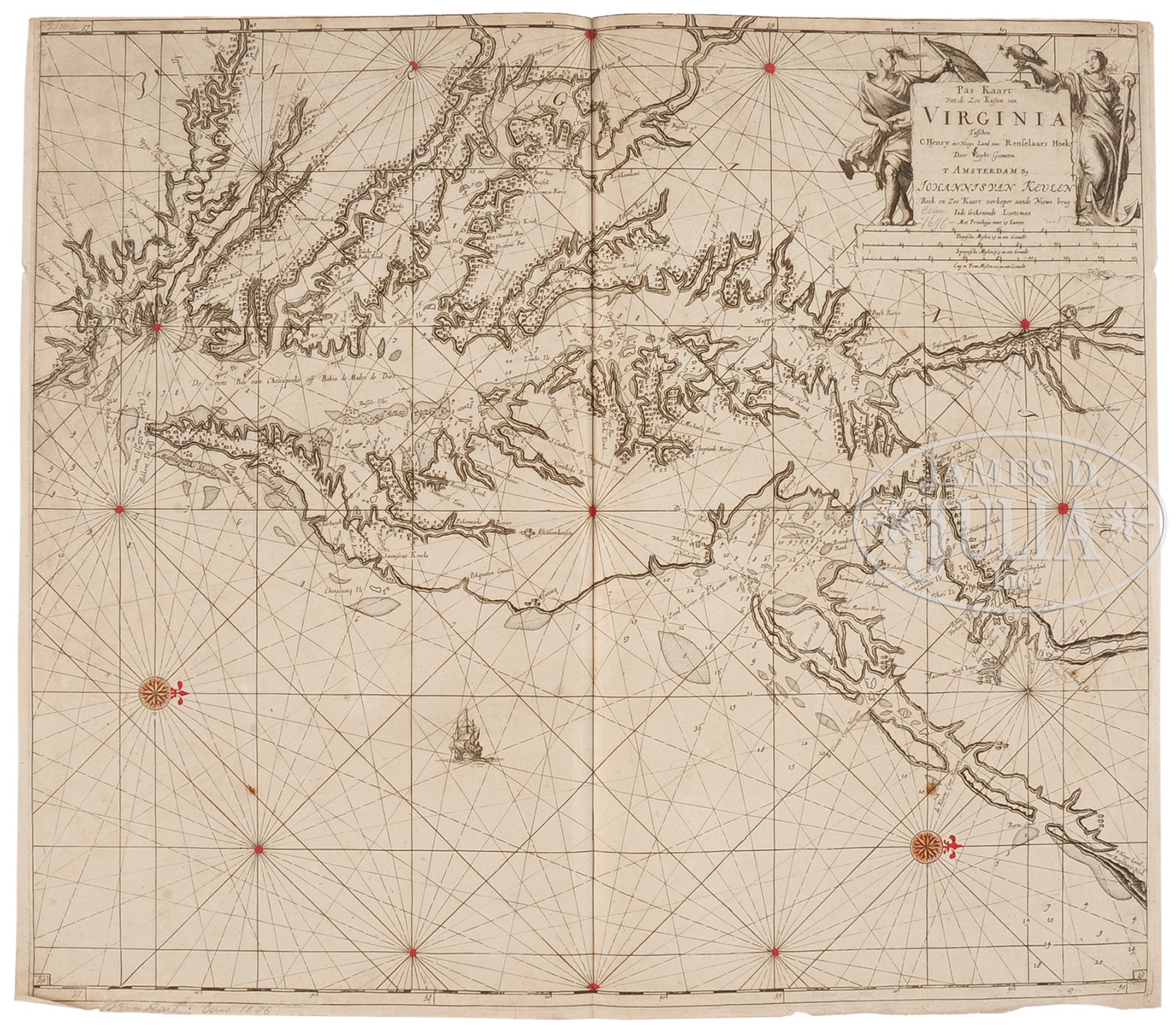 JOHANNISVAN KEVLEN MAP OF VIRGINIA.Circa, 1696, Amsterdam. Cartouche in upper right corner reads: “Pas Kaart / van de Zee Kujten van / VIRGINIA / Tuffchen / C Henry en t Hooge Land van Renfelaars Hoek / Door Vooght Geometra / T AMSTERDAM By / JOHANNISVAN KEVLEN / Boek en Zee Kaart verkoper aande Niewe brug / Inde Gekroonde Lootsman / Met Privilegie voor 15 Iaaren”. The map depicts the coastline of Virginia and Chesapeake Bay with hand-colored compass points. SIZE: 20-1/2″ h x 23-1/2″ l. PROVENANCE: Private Central Maine Collection CONDITION: Very good with minimal toning and with minor creasing and weakness at edge of paper outside of map border. 49794-4 (800-1,200) – Lot 2191