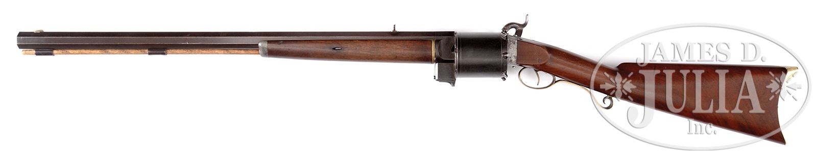 SUPERB SEVEN SHOT WILLIAM BILLINGHURST REVOLVING RIFLE.SN NSN. Cal. 40. 24″ bbl. 7-shot pill lock converted to percussion revolving rifle with 2-pc walnut stocks and ornately engraved back action percussion lock. Windage adjustable blade front sight with semi-Buckhorn rear sight mounted in bbl. William Billinghurst, of Rochester NY, was famed for his revolving rifles as well as the development of the modern fishing reel. His firearms production was known from 1834 through 1838. CONDITION: Exceptionally fine overall as bbl and receiver are a fine plum brown. Action and lock function properly. A small amount of engraving on upper tang of rifle and matching engraving on lock are quite nice and are done in a Germanic influenced pattern. Traditionally having had a tang sight, as with many of these rifles, as young eyes become old eyes, the sight was moved forward to a barrel position for the shooter’s comfort. Walnut stocks are very fine with only minimal material loss at tang and key way for holding the forearm im place. The hickory wiping rod appears to be of a more contemporary period. An exceptionally fine example of a very rare American rifle. 50422-2 TDW (5,000-8,000) – Lot 2192