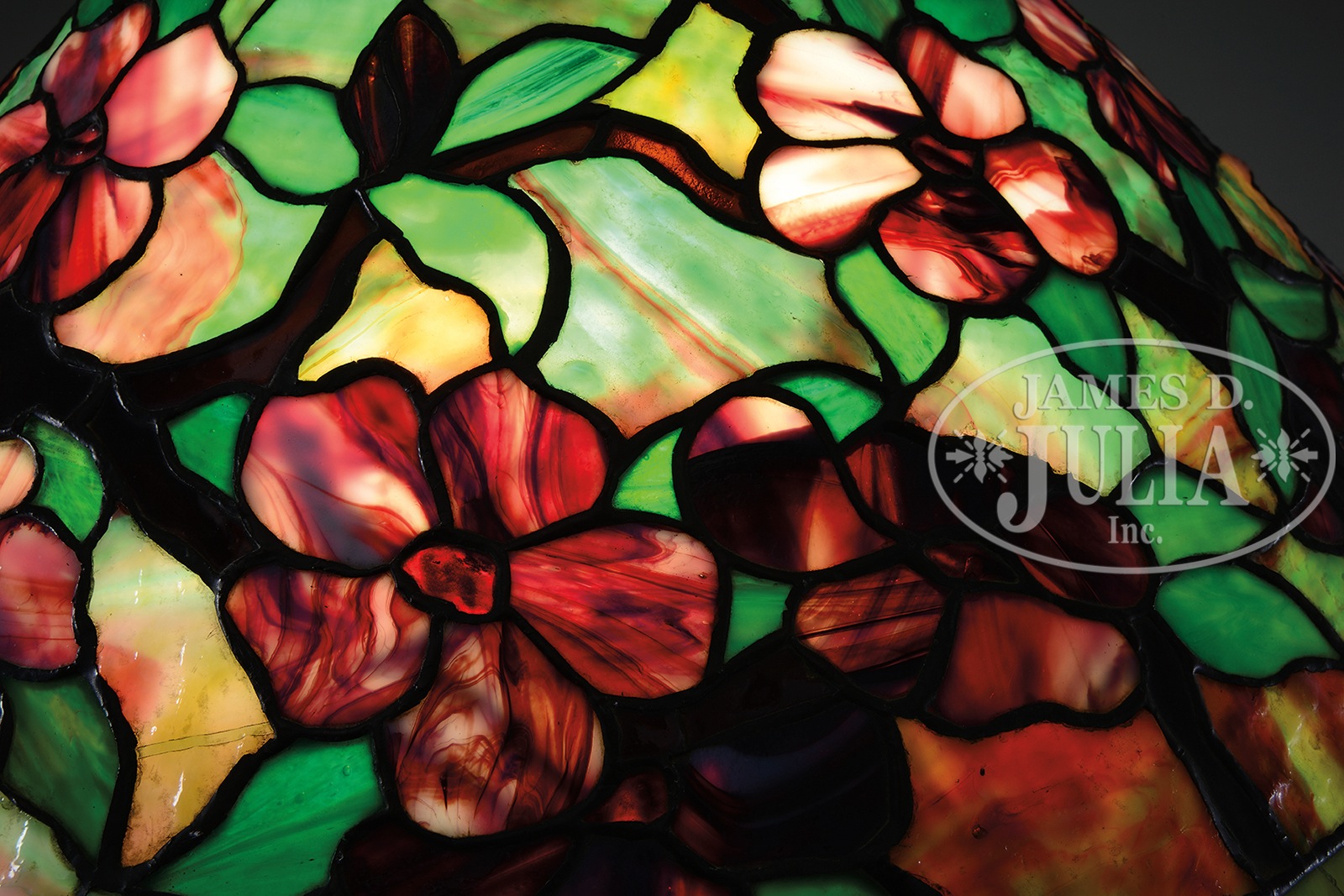 LEADED FLORAL TABLE LAMP ATTRIBUTED TO RIVIERE.Leaded glass table lamp attributed to Riviere has conical shade with rich red, white and purple striated flowers and green leaves set against a striated green granite glass background. Shade is unsigned and rests on a simple stick base with two-socket cluster. Base has a rich dark brown patina. Unsigned. SIZE: Shade is 20″ dia. Lamp is 23″ t. CONDITION: Shade is very good with just a few tight hairlines and a small lead separation near the bottom. Base is very good to excellent with some minor wear and discoloration to patina. 5-68773 (6,500-8,500) – Lot 2193