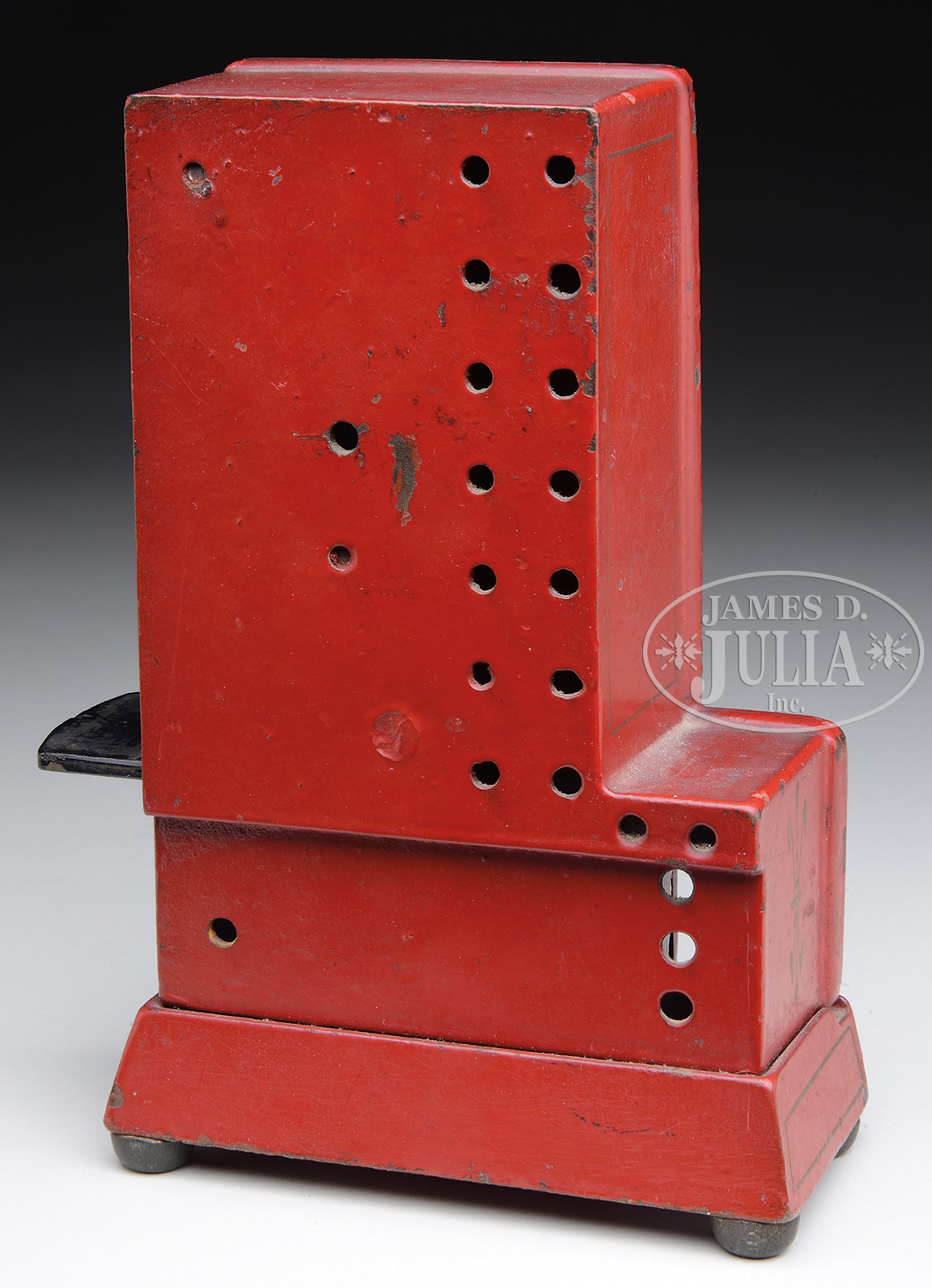 COLUMBUS MODEL 36 ONE CENT GUM MACHINE.A great all-original diminutive gum machine. It is hard to believe that this machine did not often disappear from the locations in which they were utilized. This tiny machine has large visual attraction, and could literally fit in someone’s coat pocket. Enameled in dark red with a plethora of gilt pinstriping and highlighting, the mechanism was a simplistic beyond belief. A coin is dropped in and the black lever on the side is pushed in, dispensing a single tab of gum. Machine is in great original condition and a light cleaning/polishing would make the overall appearance pop. This machine appeals to collectors of both iron machines and cast iron toys as well. SIZE: 8″ h x 5″ w. CONDITION: Fresh from the attic and just in need of some minor lubrication and a key for the front panel (lock intact). 48252-1 (1,500-2,500) – Lot 2193 Auction: Advertising, Toy & Doll - Spring 2015 Please Note: All prices include the hammer price plus the buyer’s premium, which is paid by the buyer as part of the purchase price. The prices noted here after the auction are considered unofficial and do not become official until after the 46th day. |