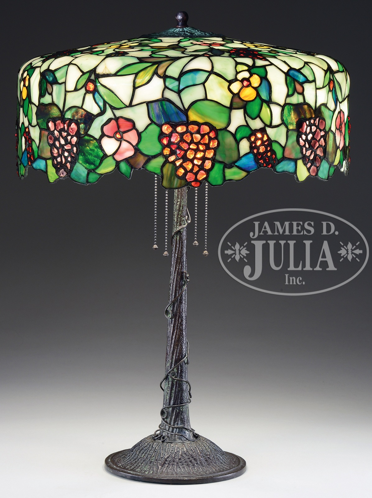 JOHN MORGAN & SONS TABLE LAMP.Large John Morgan & Sons table lamp has grape clusters of leaded chunk jewels with shaded blue and green leaves surrounding. Shade is dotted with random five-petal flowers with green stems and leaves against a lightly striated green and white background. Shade rests on its original Morgan base with hammered foot and applied bronze wire vining up the stem of the base. Base is completed with a four-socket cluster. Unsigned. Similar example can be found in the book “Mosaic Shades, Volume II” by Paul Crist, p. 112. SIZE: Shade is 20″ dia. Lamp is 28-1/2″ t. CONDITION: Shade is very good to excellent with only a few tight hairlines. Base is very good with some very minor wear and discoloration to patina. Rewired with appropriate cloth cord. 5-68854 (7,500-9,500) – Lot 2196