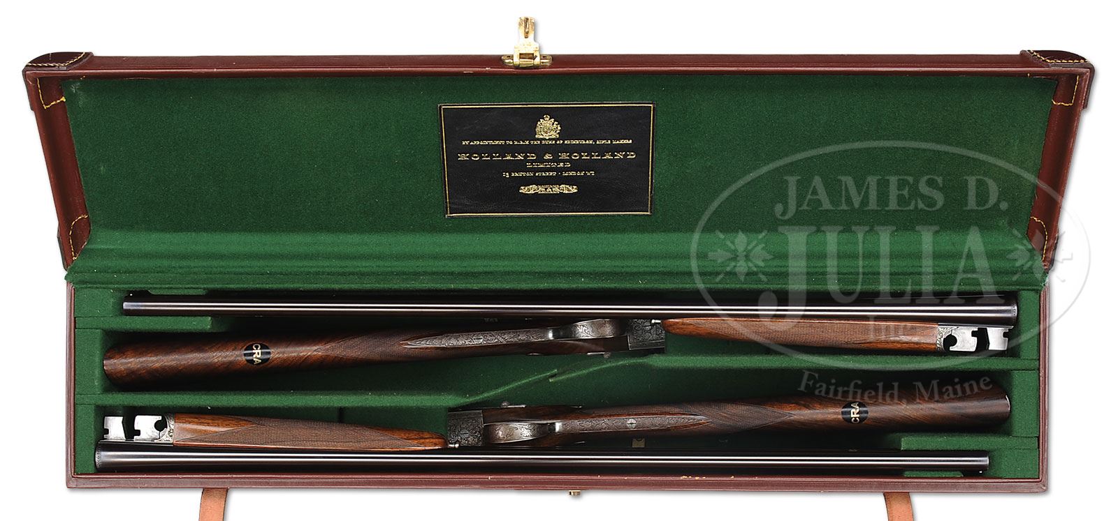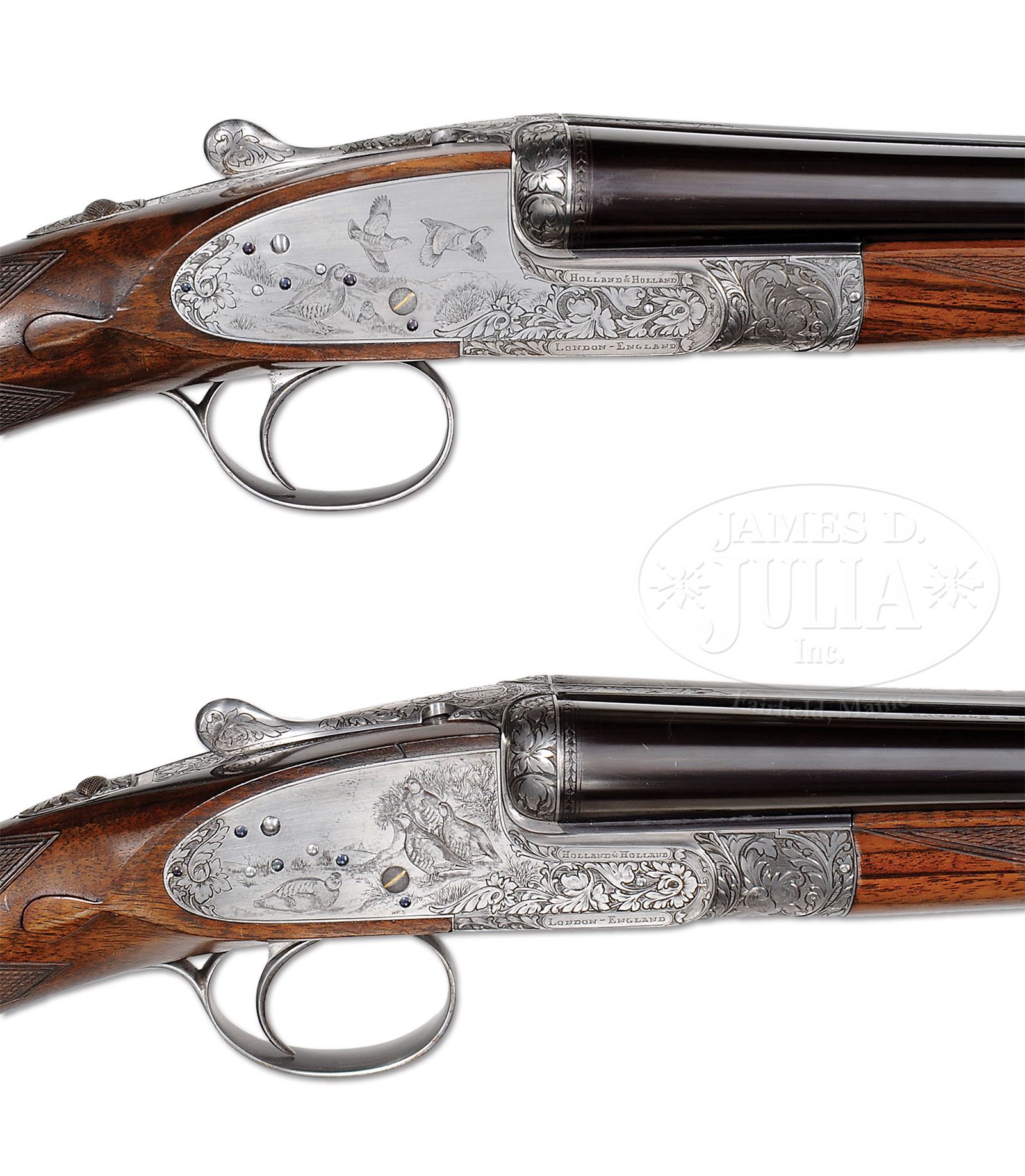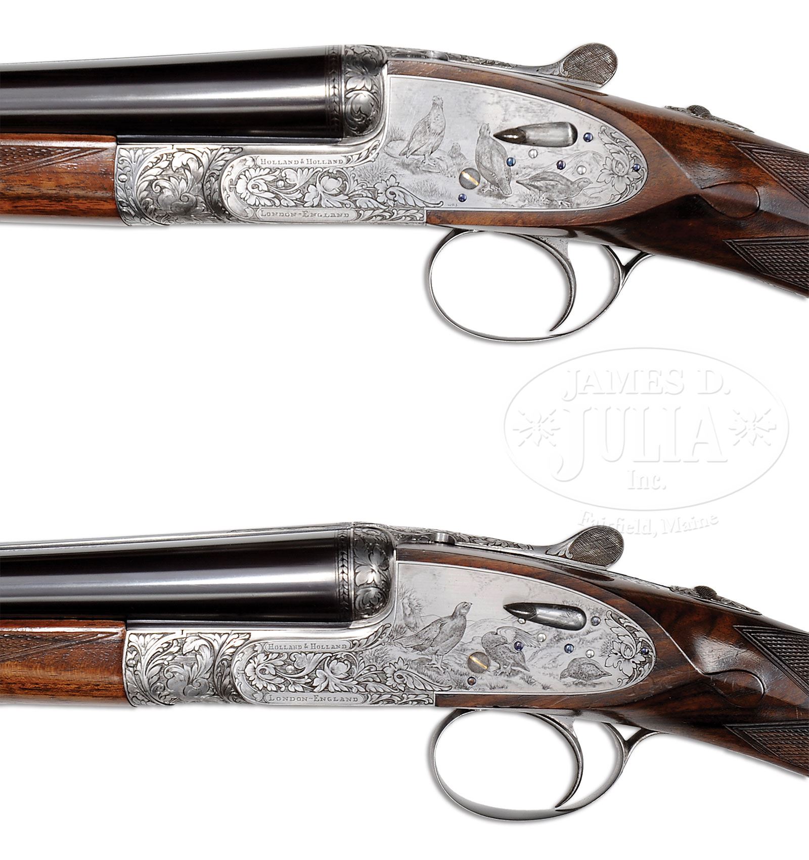 SN 40592/ 40593. Cal. 28 ga. 2-3/4″ Chambers. 27″ Chopper lump bbls with narrow game ribs are engraved “Holland & Holland.” and “33, Bruton Street, London.” on tops. Guns are made as a pair and the numerals “1” or “2”, for each gun respectively, are gold inlaid on rear portion of ribs, top levers, and forend tips. Bbl flats are stamped with 1981 London proofs for 2-3/4″ chambers. Bottoms of bbls are stamped with SNs, and each bbl set is fitted with Holland & Holland self opening assist spring. Coin finished small sidelock actions feature automatic safeties (SAFE inlaid in gold), gold line tumbler end cocking indicators, single non-selective triggers, and H & H style hand detachable locks. (Bridles scroll engraved) Actions are engraved with well cut large shaded scrolled acanthus at nearly full coverage framing Bulino vignettes of flushing pheasants against clouded skies on bottoms. Lockplates have matching scroll on front portions. Rear portions are engraved with exceptionally well done, intricately detailed Bulino scenes of red grouse and red leg partridge in various quiet poses. Gun no. “1” has group of four grouse perched on rocks looking over hillside on left lockplate; with four partridge on right, two flying, two standing on open moor. Gun no. “2” has three grouse on left, again on hillside, one preening with lifted wing; right lockplate depicts a covey of partridge, three standing in lee of a banking, and one dusting. These fine lockplate scenes have engravers initials “WPS” at bottoms; engraver’s full signature, W. P. Sinclair, is on each trigger plate. (Bill Sinclair worked in the firearms industry in Great Britain until he tried engraving in 1971, with the encouragement of Ken Hunt. In 1978 he took up the work full time.) Single beaded small bow trigger guards depict flying grouse on bow. SNs are on bands across acanthus scroll on tangs. Well matched, dramatically marbled, and lightly figured European walnut straight grip buttstocks measure 14-1/2″ over checkered wood butts, and feature diamond hands, drop points, point pattern checkering with mullered borders, and inlet composition circles further inlaid with individual initials “CRA” on toe lines. Matching splinter ejector forends have Anson releases. Gun no. “1”: Bore diameter: left-.548, right -.550. Bore restrictions: left -.010 (Mod), right -.008 (IC). Minimum wall thickness: left -.025, right -.022. Drop at heel: 2-1/2″, drop at comb: 1-1/2″. Weight: 5 lbs. 8 oz. LOP: 14-1/2″. Gun no. “2”: Bore diameter: left-.548, right -.549. Bore restrictions: left -.009 (Lt Mod), right -.007 (IC). Minimum wall thickness: left -.030, right -.025. Drop at heel: 2-1/2″, drop at comb: 1-1/2. Weight: 5 lbs. 8 oz. LOP: 14-1/2″. Brown leather double motor case with stitched leather corners is embossed “C.R.A.” on top. Interior is lined in dark green cloth, with black leather gold embossed H&H label in lid, and contains 2-pc walnut and brass cleaning rod with mop, brush, and jag, H&H marked round oil bottle, pair of snap caps, and a striker bottle with spare strikers. Also there is an empty tin of H&H Rangoon oil, a pull through cleaning kit in black plastic wallet, and some cleaning patches. CONDITION: Excellent, with evidence of only light field use, and a few minor marks and scratches on bbls, mostly on gun no. “2”. Coin finish of action shows some darkening. Stocks have some light marks in their orig finish, again gun “2” has seen more use and has some considerable marks at rear of lockplates. Bores are excellent. Mechanically crisp. Case is excellent, with a few light marks on exterior leather. Interior is excellent, as are accessories, most still wrapped in tissue. 4-50453 MGM285 (75,000-125,000) – Lot 2196