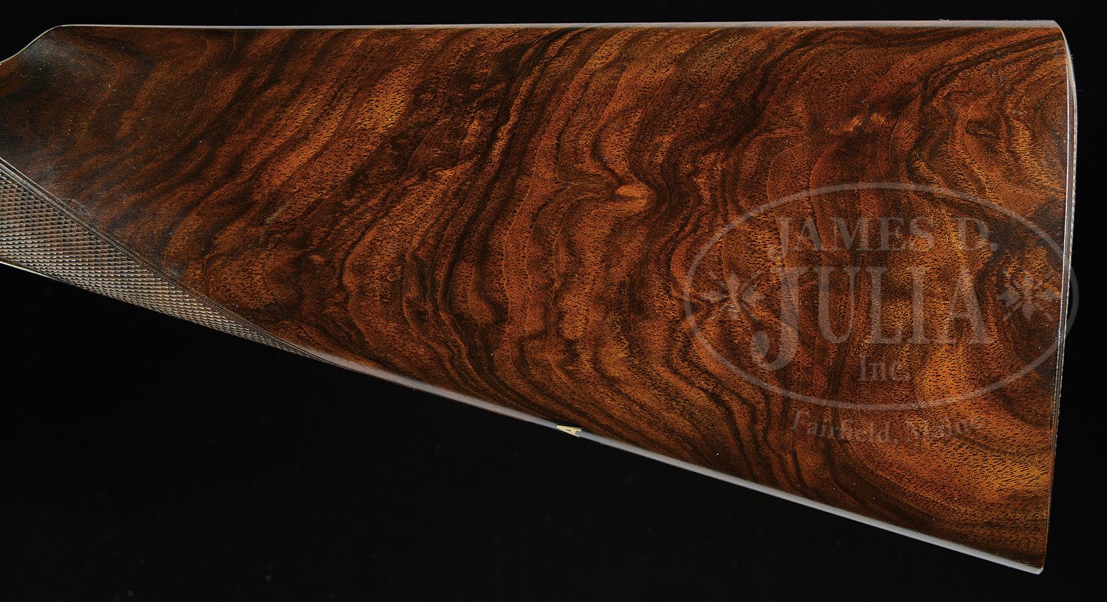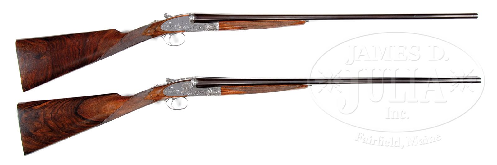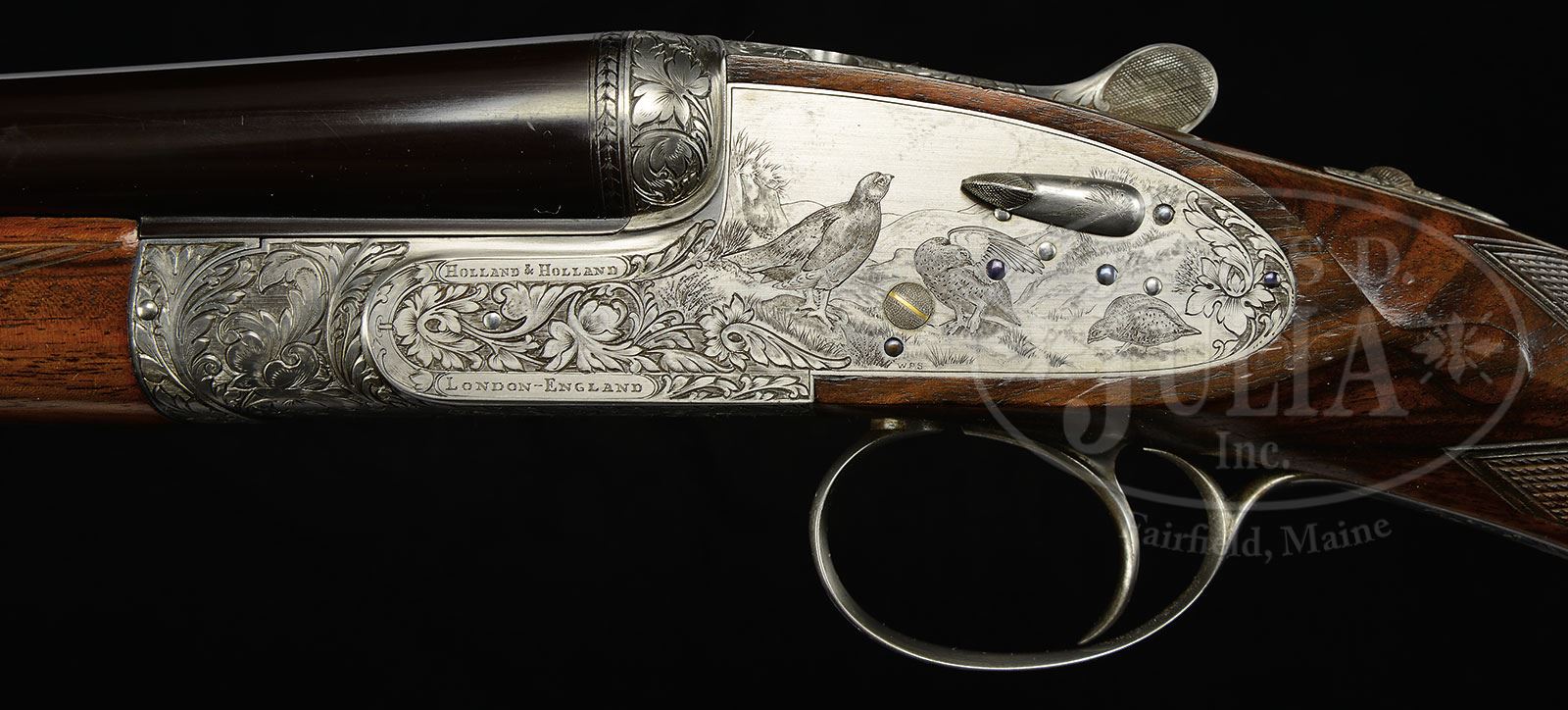 SN 40592/ 40593. Cal. 28 ga. 2-3/4″ Chambers. 27″ Chopper lump bbls with narrow game ribs are engraved “Holland & Holland.” and “33, Bruton Street, London.” on tops. Guns are made as a pair and the numerals “1” or “2”, for each gun respectively, are gold inlaid on rear portion of ribs, top levers, and forend tips. Bbl flats are stamped with 1981 London proofs for 2-3/4″ chambers. Bottoms of bbls are stamped with SNs, and each bbl set is fitted with Holland & Holland self opening assist spring. Coin finished small sidelock actions feature automatic safeties (SAFE inlaid in gold), gold line tumbler end cocking indicators, single non-selective triggers, and H & H style hand detachable locks. (Bridles scroll engraved) Actions are engraved with well cut large shaded scrolled acanthus at nearly full coverage framing Bulino vignettes of flushing pheasants against clouded skies on bottoms. Lockplates have matching scroll on front portions. Rear portions are engraved with exceptionally well done, intricately detailed Bulino scenes of red grouse and red leg partridge in various quiet poses. Gun no. “1” has group of four grouse perched on rocks looking over hillside on left lockplate; with four partridge on right, two flying, two standing on open moor. Gun no. “2” has three grouse on left, again on hillside, one preening with lifted wing; right lockplate depicts a covey of partridge, three standing in lee of a banking, and one dusting. These fine lockplate scenes have engravers initials “WPS” at bottoms; engraver’s full signature, W. P. Sinclair, is on each trigger plate. (Bill Sinclair worked in the firearms industry in Great Britain until he tried engraving in 1971, with the encouragement of Ken Hunt. In 1978 he took up the work full time.) Single beaded small bow trigger guards depict flying grouse on bow. SNs are on bands across acanthus scroll on tangs. Well matched, dramatically marbled, and lightly figured European walnut straight grip buttstocks measure 14-1/2″ over checkered wood butts, and feature diamond hands, drop points, point pattern checkering with mullered borders, and inlet composition circles further inlaid with individual initials “CRA” on toe lines. Matching splinter ejector forends have Anson releases. Gun no. “1”: Bore diameter: left-.548, right -.550. Bore restrictions: left -.010 (Mod), right -.008 (IC). Minimum wall thickness: left -.025, right -.022. Drop at heel: 2-1/2″, drop at comb: 1-1/2″. Weight: 5 lbs. 8 oz. LOP: 14-1/2″. Gun no. “2”: Bore diameter: left-.548, right -.549. Bore restrictions: left -.009 (Lt Mod), right -.007 (IC). Minimum wall thickness: left -.030, right -.025. Drop at heel: 2-1/2″, drop at comb: 1-1/2. Weight: 5 lbs. 8 oz. LOP: 14-1/2″. Brown leather double motor case with stitched leather corners is embossed “C.R.A.” on top. Interior is lined in dark green cloth, with black leather gold embossed H&H label in lid, and contains 2-pc walnut and brass cleaning rod with mop, brush, and jag, H&H marked round oil bottle, pair of snap caps, and a striker bottle with spare strikers. Also there is an empty tin of H&H Rangoon oil, a pull through cleaning kit in black plastic wallet, and some cleaning patches. CONDITION: Excellent, with evidence of only light field use, and a few minor marks and scratches on bbls, mostly on gun no. “2”. Coin finish of action shows some darkening. Stocks have some light marks in their orig finish, again gun “2” has seen more use and has some considerable marks at rear of lockplates. Bores are excellent. Mechanically crisp. Case is excellent, with a few light marks on exterior leather. Interior is excellent, as are accessories, most still wrapped in tissue. 4-50453 MGM285 (75,000-125,000) – Lot 2196