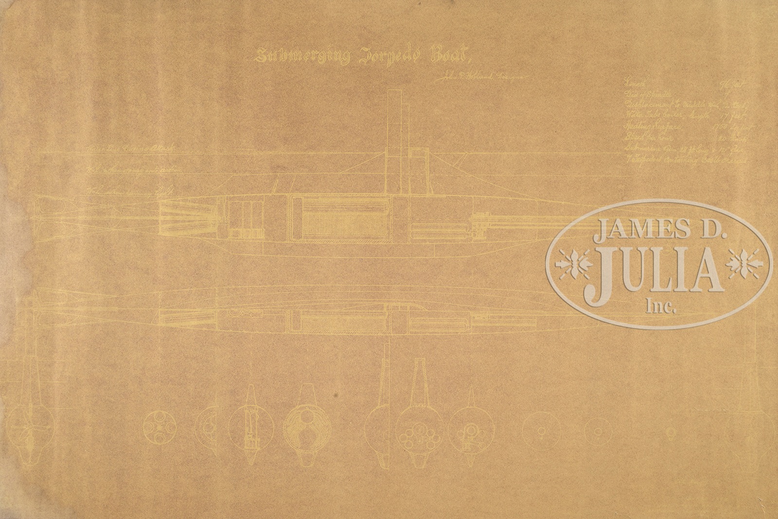 Size of 3) Fish Torpedo should be 3′ x 16′ NOT inches MASSIVE ARCHIVE ON THE EARLY AMERICAN HISTORY OF SUBMARINES AND TORPEDOES INCLUDING 2 UNIQUE 19TH CENTURY MODELS AND MANY UNIQUE AND HISTORICALLY IMPORTANT ARCHITECTURAL DRAWINGS, RARE MANUSCRIPTS AND BOOKS.This important and historic archive can never be duplicated and details the history of submarine and torpedo warfare from the early 18th century to the late 19th century. Fabulous engineering drawings, models, manuscripts, pamphlets and books have been compiled by a 50 year U S Navy Submariner (21 years active, 29 as a civilian). Incredible engineering diving boat model, circa 1813. This model greatly resembles the torpedo boats described in the War of 1812 letters and newspapers. The model measures 17-1/2″ x 4″ x 3-1/3″. The model has what appears to be a detachable lead keel. The top of the model is shaped in a curved, turtle shell appearance with two holes (fore and aft, center topside) installed, apparently to hold the masts when put into place, or to be used as air holes. A wooden belt, installed with 18th century cut nails, runs the full length of the craft, forward and aft along both port and starboard sides to act as a protective bumper. Original patina completely covers the whole model, the hand cut nail heads and the two broken spars/masts. The two broken spars (or masts) fit correctly in the two holes located fore and aft topside-center on the turtle-shell deck. Each spar/mast had been broken in the middle of each, one time. This apparent Engineering Ship’s model very closely resembles that vessel shown in a watercolor sketch made by British Lieutenant Bowen, after the British made a thorough inspection of the vessel, prior to blowing it up in July 1813. This model is quite similar to that shown in the sketch with exceptions – this model does not show the rudder as shown in Lieutenant Bowen’s sketch; the two topside fore-aft holes in the sketch are pictured as being located closer together than the two in the model. It is theorized that this engineering model may have been one version, perhaps slightly earlier than the final model. In a contemporary account on the Battle of Stonington, several British officers described and sketched it “She was 23′ long with a breadth of 10′. Her top was arched by the turtle shell and immensely strong. She had the scantling of a 100-ton ship which supported wooden top planking 8″ thick that was in turn cased over with 1/2” plate iron. Lieutenant Bowen of the Maidstone reported that she was “so strongly and well constructed that a shot cannot penetrate, or anything grapple with it”. Bowen’s report which generally confirmed and augmented the American newspaper accounts the semi- submersible drew 6′ of water, leaving only 1′ of boat exposed above the surface. The iron clad deck was painted dirty white to camouflage it. According to the British, the Turtle had a crew of 12, rather than the 9 reported by the American journalist. While the newspaper story suggested a torpedo boom of some sort, Lieutenant Bowen reported that she was designed to tow 5 floating torpedoes, each on its own lead. He was unable to explain how the crew would use these weapons against enemy ships. 2) Confederate Floating Tin Torpedo/Submarine This ‘floating tin torpedo’ was converted into a ‘submarine’ or DAVID type/HUNLEY style vessel by a U. S. Marine Corps sergeant shortly after the US Navy siege of Charleston was lifted. The Marine Corps sergeant had been stationed on board one of the US Navy ships taking part in the siege. During this period, the sergeant decided to make a model of the submarine that he and the other Marines had seen just prior to the explosion on the Houstatonic. He found a small cone shaped Confederate floating tin torpedo, ensured that the powder had all been dumped out of one end and he then soldered a small round conning tower onto the top rear portion of it. He installed diving planes on the rear conical sides and installed a rudder, all items which he claimed to have seen prior to the Houstatonic attack. This, he felt, was as close as he could come to copying the submarine he and the others had seen that night. After the war he took this submarine model, along with the story that went with it, back to his home in Lancaster County, PA. The little Confederate submarine eventually ended up being turned into a weather vane which was placed on top of the families barn where it remained until 1980. Every few years someone would remember to put a coat of black paint on this “Confederate submarine”/weathervane. In 1980 the family decided to have an auction and sell off all of the belongings in the home and farm. An antique dealer bid-in and got the whole pile of the U S Marine sergeants uniforms, guns, swords and cutlasses, the submarine (which had been taken down from the top of the barn in order to go into the auction), his medals and a grouping of approximately 114 letters written by the Marine Corps sergeant to his family back home during the War of the Rebellion. The dealer spent 10 years getting the letters transcribed and then he sold the letters as one lot to the Museum of Confederate History in South Carolina. After he sold the letters, the consignor purchased the submarine. This is numerous literature supporting this rare and unique Confederate model. There are 7 fabulous, unique engineering and architectural drawings of some of the earliest self-propelled torpedoes. 1) & 2) Moveable Submarine Torpedo – Hand drawn blueprints, January 1869 by John L. Lay. Two original inventors pen and ink drawings, one signed Submarine Boat by J.L. Lay, January 1869 – Buffalo, NY on separate folio sheets. The larger of the two drawings, 39″ x 22″ shows a diagram type drawing that displays a side view of the cylindrical torpedo body with conical ends and shows an interior reel fro the guidance wire to attach to. A second view on the larger diagram typ
