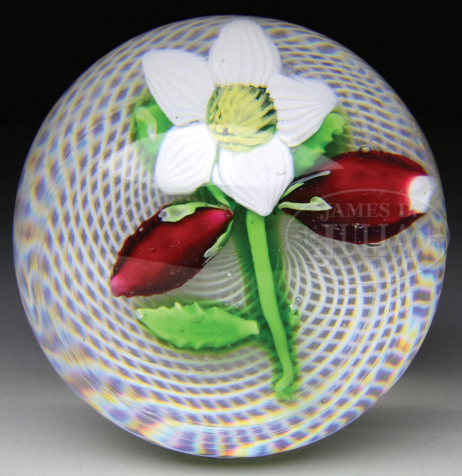 FOUR ANTIQUE PAPERWEIGHTS.1) Clichy bouquet with three flowers; one purple flameworked and one pink and one multicolored cane flowers as well as four buds all tied with a ribbon resting on a latticino basket. 2) Bohemian millefiori on upset white mulsin. Six canes; two with silhouette. 3) St. Louis strawberry with one white flower with green stem and leaves on a white latticino basket. 4) Napoleon sulphide over a three cane posy. SIZE: 1) 2-1/2″ dia. 2) 2-3/4″ dia. 3) 2-1/2″ dia. 4) 3″ dia. CONDITION: 1) Dome has been ground down, obscuring the purple flower. 2) Very good to excellent. 3) One strawberry has white underlay that bleeds through the red. Design is off centered. 4) Good with some bubbles and flecks inside of glass. 5-69557, 5-69561, 5-69569, 5-69570 (1,000-1,500) – Lot 2197
