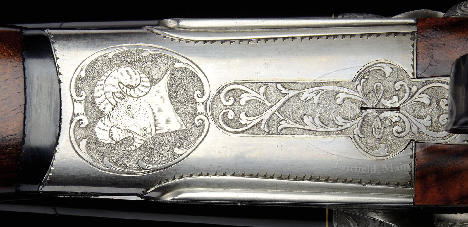 *SIACE HAMMER DOUBLE RIFLE IN 30-06 WITH CASE.SN 45839. Cal. 30 – 06. 24″ Mono-bloc bbls fitted with quarter rib holding one standing leaf rear sight, and front ramp holding gold bead, are engraved with importers name and address (Danzel Listo), and with Siace name and address on tops. There are inlaid gold wire embellishments at breech ends. Bbl flats are stamped with 2005 Italian nitro proofs and SN. Coin finished top lever action is fitted with bar locks having tall serpentine hammers. Action features non-automatic safety and dbl triggers. It is engraved with about 50% coverage well done large trailing scroll in fine stippled background. A portrait of a big horn ram is on bottom. Lockplates are relatively plain, having only geometric borders. Left plate is engraved “Siace di Gelmini”, with right lock engraved “Gardone V.T.” Single beaded trigger guard has SN at grip. Finely marbled and figured European walnut square knob pistol grip buttstock measures 14-3/8″ over thin rifle pad. Stock features right hand shadow line cheekpiece, drop points, and point pattern checkering. Matching small beavertail forend has slightly schnabeled tip and Anson release. Drop at heel: approx 2-3/8″, drop at comb: approx 1-3/8″. Weight: 7 lbs 10 oz. LOP: 14-3/8″. Green canvas Emmebi case with tan leather trim, lined in brown velvet has Siace label in lid, and contains green bags for action and bbls, pair of 30-06 snap caps, and a bore snake. CONDITION: Excellent, essentially as new, except for some minor stains on breechface, and a few marks on wood and metal. Mechanically crisp. Case is excellent. 49610-3 MGM341 (4,000-6,000) – Lot 2197