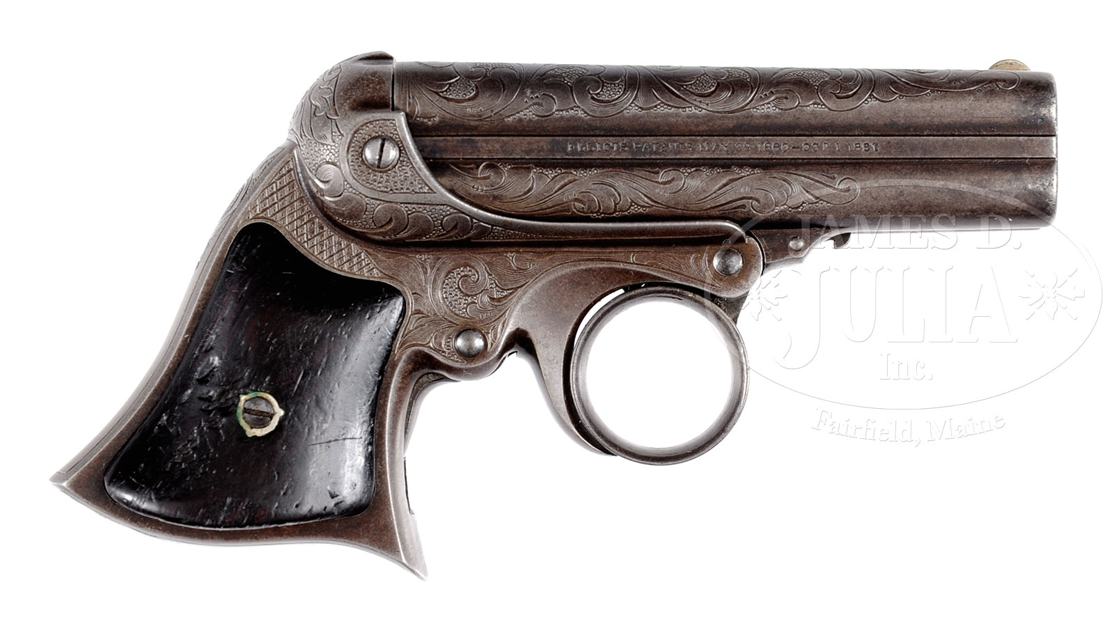 NEW YORK ENGRAVED REMINGTON-ELLIOT NO. 2 FOUR BARREL DERINGER PISTOL.SN 19662. Cal. 32RF. 3-3/8″ bbl cluster. 2-pc rosewood grips. Deringer is engraved overall in the New York style. Left bbl rib bears the Remington address. Right bbl rib shows Elliot’s patent mark. SN is stamped on the inside of the frame and on the bottom of the bbl cluster. Engraving is of the vine motif and is present on all 4 bbls with the top bbl engraving going the full length almost to the muzzle. Bottom bbl engraving goes two thirds to the muzzle. Frame engraving is also in a vine motif with a fine punch dot background and is seen on either side, on the recoil shield and the upper backstrap and butt. There is a checkerboard accent on either side of the frame above the grip. PROVENANCE: Bruce Burtner Collection. CONDITION: Very good. Bbl cluster shows a smooth gray blue patina overall with traces of blue in protected areas. Rib markings are sharp. Engraving is sharp and unpolished. Bores are bright with strong rifling and some staining. Frame is also a deep blue gray patina with traces of blue in protected areas. Engraving is sharp and unpolished. Rosewood grips retain a considerable amount of varnish finish and show numerous handling marks and high point wear. Right grip has some dents near the screw. One of a total of 25,000 made which includes production of the 22 cal. model. Made circa 1863-1888. 51641-22 TEP (1,000-1,500) – Lot 2201