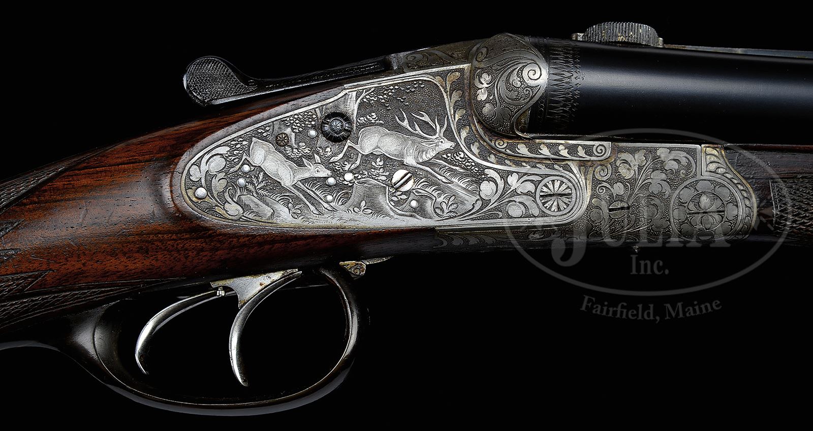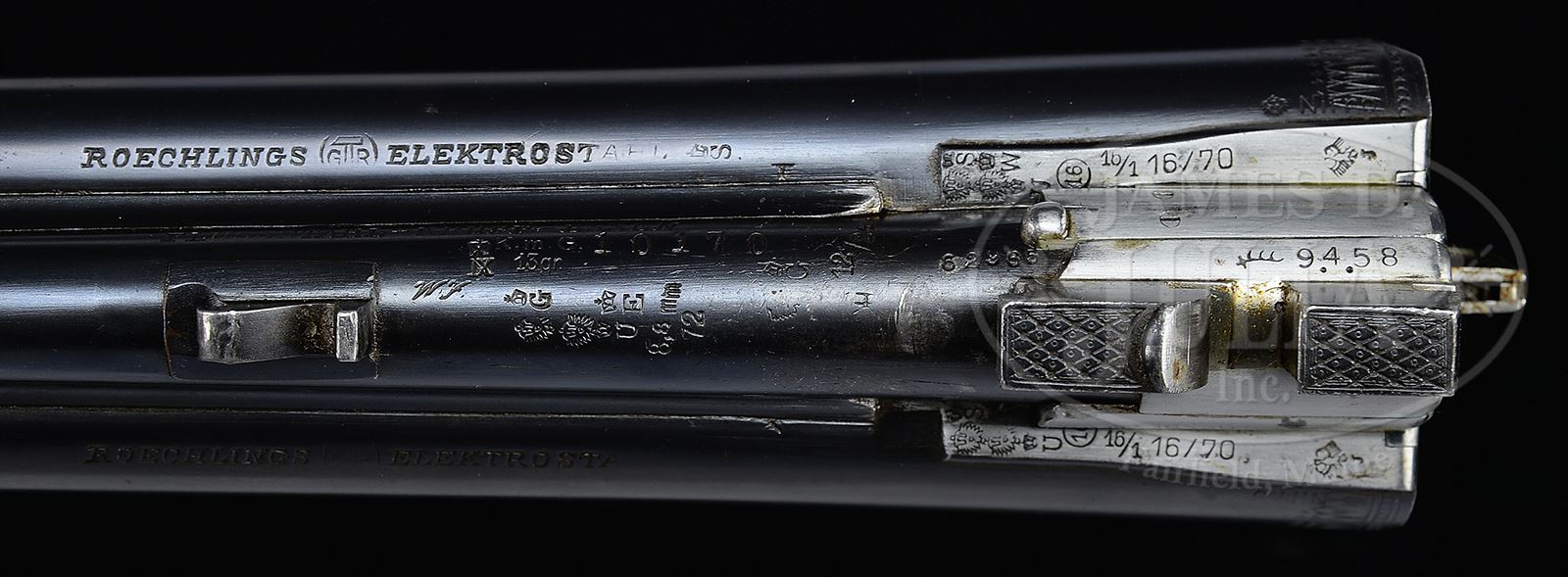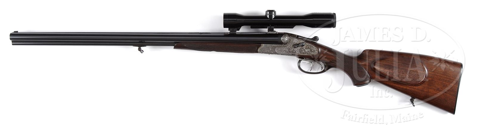 *SEMPERT & KRIEGHOFF SIDELOCK DRILLING WITH SCOPE.SN 10170. Cal. 16 ga x 16 ga x 93×72. 25-5/8″ Bbls are fitted with full length matted rib mounting flip-up rear sight, actuated by bbl cocking lever, claw scope bases, and silver bead front sight. Tops of bbls are engraved “Sempert & Krieghoff” and “Suhl”. Bbl flats are stamped with imperial German nitro proofs for 2-1/2″ chambers and 1958 Ulm re-proofs for 2-3/4″ chambers. Bbls are stamped with steel information. Lightly color hardened sidelock action features safety toggle on left lockplate, rifle cocking lever on left side, crossbolt third fastener, side clips, raised rib tumbler end cocking indicators, and double triggers (front set). Action is engraved with near full coverage large trailing acanthus in stippled background. Lockplates have sprays of the same scroll surrounding game scenes; roebuck and ducks on left lock, and stag and hind running through cut over forest land on right. Monogram “FK” is on top lever. Trigger guard is of horn. Relatively plain European walnut horn capped pistol grip buttstock with slightly hogbacked comb measures 13-7/8″ over ribbed horn buttplate, and features small shadow line right hand cheekpiece, and point pattern checkering at grip. A sling loop matching that on bottom bbl, is on toe line. Matching small forend with inset horn tip has Deeley release. Hensoldt Diatal – D 4 X 32 rail scope with three post reticle is in claw mounts. Bore diameter: left -.672, right -.672. Bore restrictions: left -.025 (Imod), right -.018 (mod). Wall thickness: left -.028, right -.036. Drop at heel: 2-7/8″, drop at rear of hogback: 2-5/16″, drop at comb: 1-5/8″. Weight without scope: 7 lbs 2 oz. LOP: 13-7/8″. Also included with this high quality drilling are ten RWS 93 x 72 cartridges in box with orange labels. CONDITION: Fine. Bbls retain essentially all of a satin re-black. Action retains most of its coin finish, silvered to pewter gray. Added oil finish. There is a small stress crack behind left lockplate. All bores are excellent. Rifle bore has one or two small pits. Scope has some scuffs in lacquer, optically clear. 49432-10 MGM368 (6,500-10,000) – Lot 2203