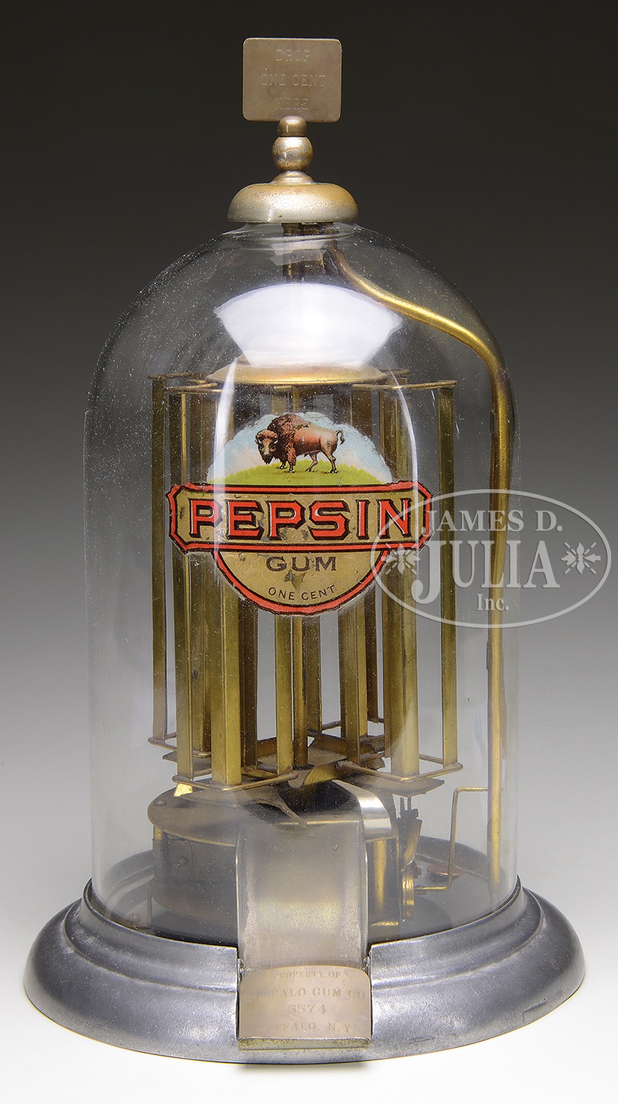 RARE BUFFALO GUM VENDOR.This machine was manufactured by White Vending Co., the same company that made the cast iron Happy Jap gum vendor. An elaborate clockwork mechanism that when a coin was deposited the mechanism would trip and the four gum columns would turn 1/4 revolution dispensing a piece of gum. A fabulous original decal on front & side of the globe picturing a buffalo, in huge letters “PEPSIN”, and in small letters “GUM 1¢”. Overall the decal is in very good condition with some minimal lifting most noticeable in the gold background. A slotted ball on top of the machine more than likely held some sort of a sign which the original is missing but a wonderful replica has been made, on one side indicates, drop one cent here” and on the reverse side, “Property of Buffalo Gum Company”. This is a great, rare gum vendor and just one of a handful of early machines that had exposed clockwork mechanisms. SIZE: Approx 14-1/2″ t. CONDITION: Overall good to very good original. It appears that above gum delivery chute there was originally a little plaque indicating the White Gum Co. of Buffalo New York. A very fine replica has been made which is pictured and just needs to be soldered into place. 37587-32 (8,000-10,000) – Lot 2204 Auction: Advertising, Toy & Doll - Spring 2015 Please Note: All prices include the hammer price plus the buyer’s premium, which is paid by the buyer as part of the purchase price. The prices noted here after the auction are considered unofficial and do not become official until after the 46th day. |