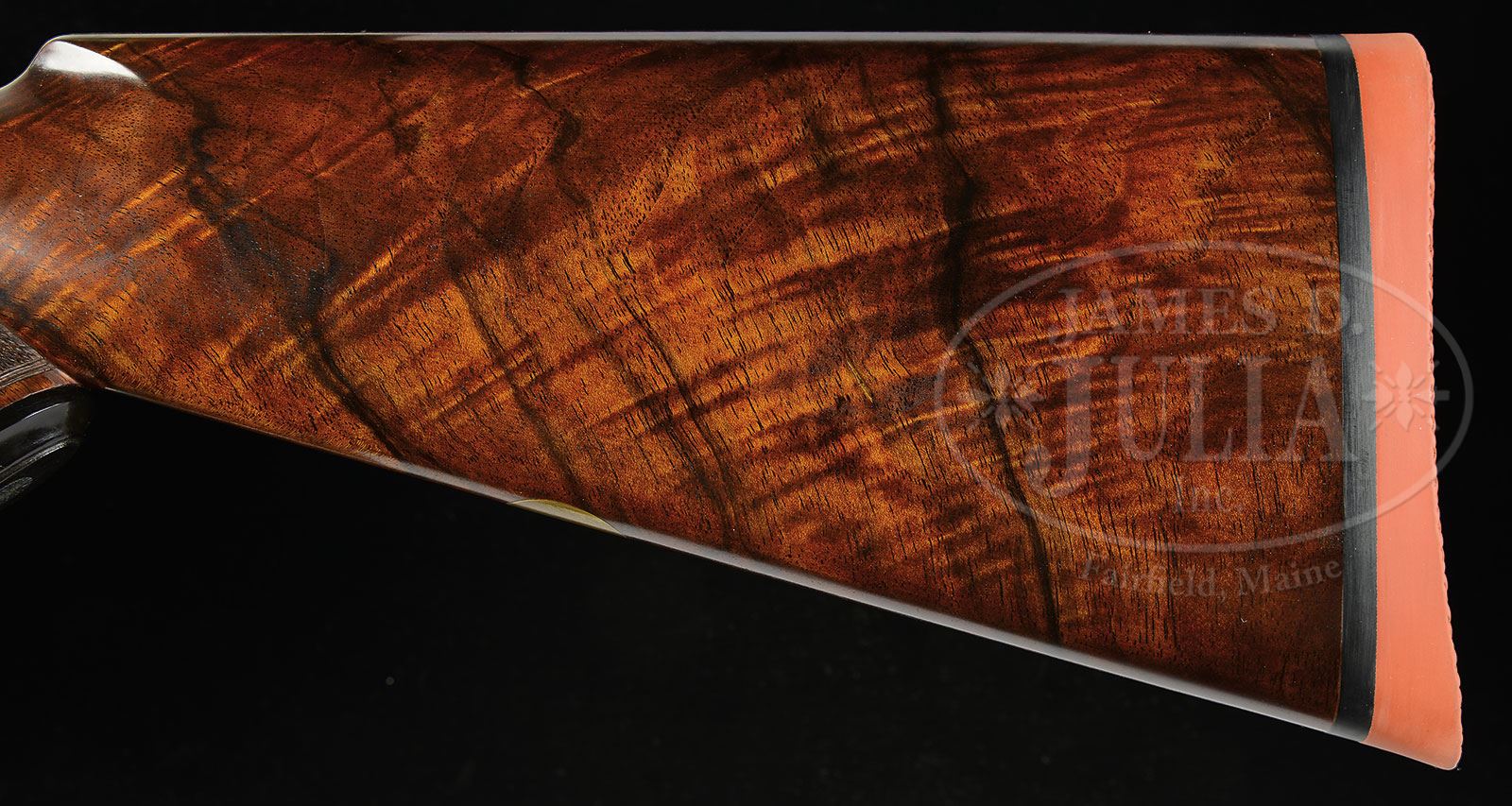 *RARE, EXCEPTIONAL, NEAR NEW, EXTRA FINISH PURDEY SINGLE BARREL TRAP GUN WITH CASE.SN 27814. (ca 1972) Cal. 12 ga. 2-3/4″ Chamber. This scarce (59 produced) top-of-the-line trap gun has 32″ bbl with raised, matted, ventilated rib, fitted with two white beads. Top left of bbl is engraved “J. Purdey & Sons. Audley House. South Audley Street. London. England.” Bbl flat is stamped with London nitro proofs, and bottom of bbl with “PURDEY”, SN, and bbl maker’s initials “AH” (Alf Harvey). Tube no. “67926” is on loop. Nicely filed, case hardened, Beesley patent action fires with the left lock (right lockplate is “dummy”). There is no safety. Action is engraved with exceptionally well cut and shaded, large, scrolled acanthus with strap work highlights. Fence is relief carved with oak leaves and acorns. This extra finish pattern was often used by noted engraver, Ken Hunt, who most likely engraved this gun (no signature can be found). “J. Purdey & Sons” is on each lockplate, as well as on bottom of action where it is in an oval over “London” and “England”. Blued small bow trigger guard has matching scroll on bow, with SN on tang, which extends to horn grip cap. Lovely, well marbled, and nicely figured European walnut capped pistol grip buttstock measures 14-1/2″ over solid red basket-weave Pachmayr pad. Classic Purdey style drop points are behind lockplates. Point pattern checkering with mullered borders is at grip. A vacant gold oval is on toe line. Matching beavertail ejector forend has Anson release. Bore diameter: .732. Bore restriction: .041. (Full) Drop at heel: 1-7/8″, drop at comb: 1-3/8″. Weight: 7 lbs. 12 oz. LOP: 14-1/2″. Orig maker’s leather case with stitched leather corners is lined in burgundy cloth and has black leather gold embossed Purdey label along with charge label for this particular gun, in lid. Case contains 2-pc brass and walnut cleaning rod with mop and brush in black vinyl wallet, with Purdey marked snap cap and square oil bottle, along with case straps. Spare firing pin is rolled in a light purple envelope marked with SN. PROVENANCE: William Hammond Collection. CONDITION: Essentially, as new, with only the faintest of minor handling marks in wood and metal, and light extractor wipe marks on breechface. Our consignor ordered this gun new and he has never fired it. It remains unfired outside of the factory since delivery to our consignor. Mechanically crisp. Case also appears near new, with one or two of the lightest marks. Interior cloth has slight impressions from contact with gun. An investment quality and condition classic. Replacement cost for this gun today from Purdey’s is quoted at $135,000. 4-50478 MGM230 (15,000-25,000) – Lot 2205