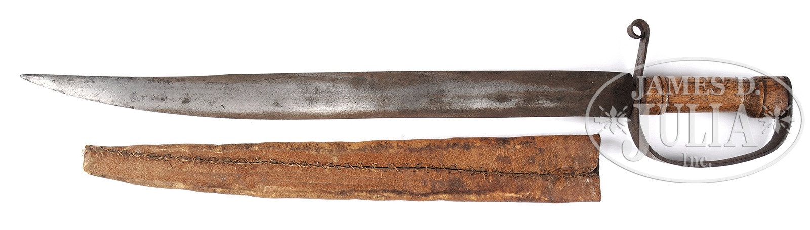This unique D Guard Bowie is shown on pg 222 of Confederate Bowie Knives by Melton, Phillips & Sexton. It is the only Confederate knife I have noted with an orig deerskin scabbard. This massive knife measures just over 24″ with a 19-1/2″ clip point blade. Wood grip is nicely carved with primitive folk art turnings. PROVENANCE: Ex-Dan Schneider, Los Angeles, CA; Wayne McNeese Collection, 2003. CONDITION: Very good to fine overall. Blade has areas of shine showing orig tool marks. Stained and dirty at ricasso where scabbard has shrunk. Scabbard is solid with some broken stitching and about 2-1/2″ of tip missing. Iron overall with iron patina and pitting. Grip sound, solid with hand worn patina with several long hairline cracks. 50427-12 JS (5,000-7,000) – Lot 2205