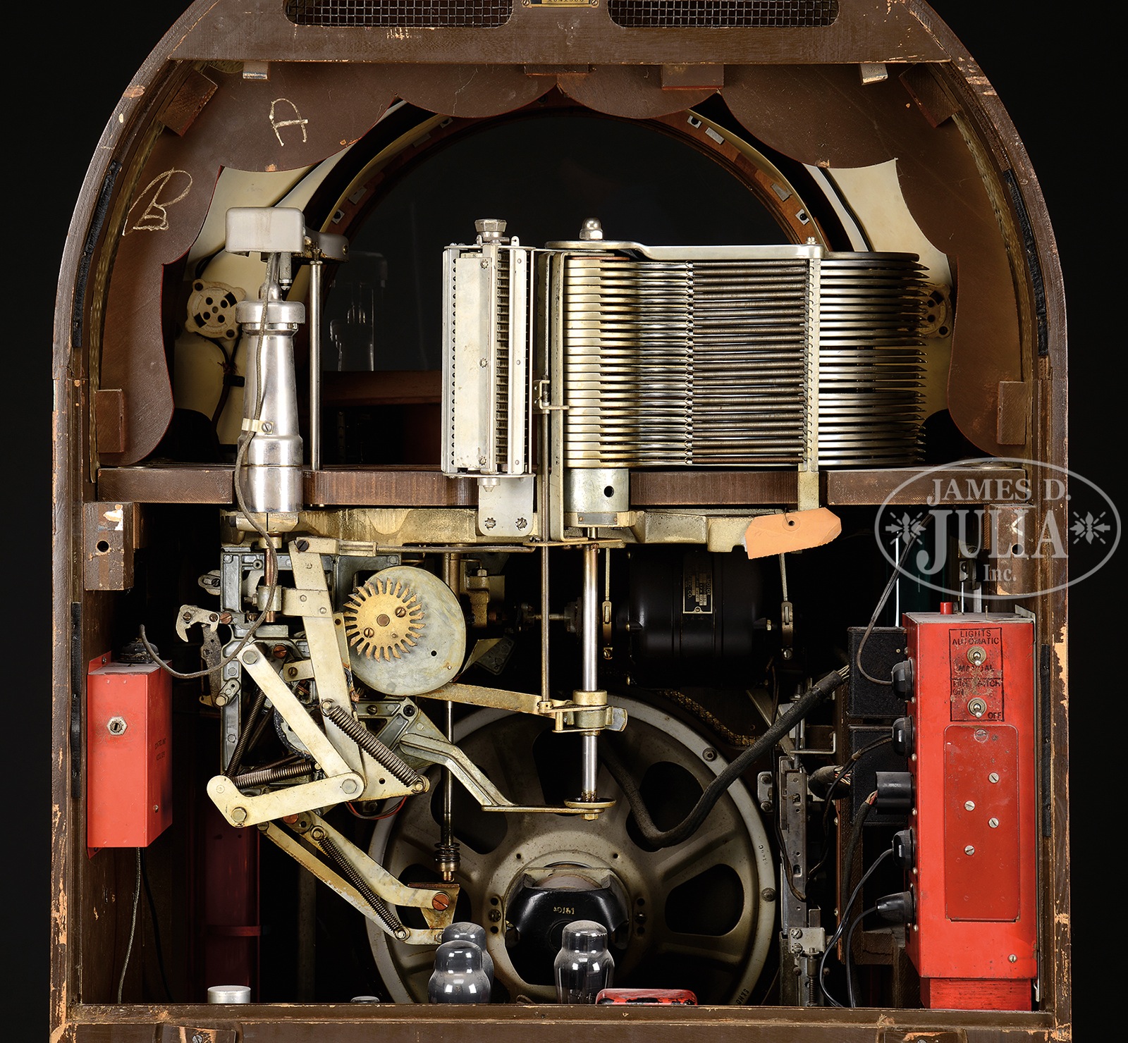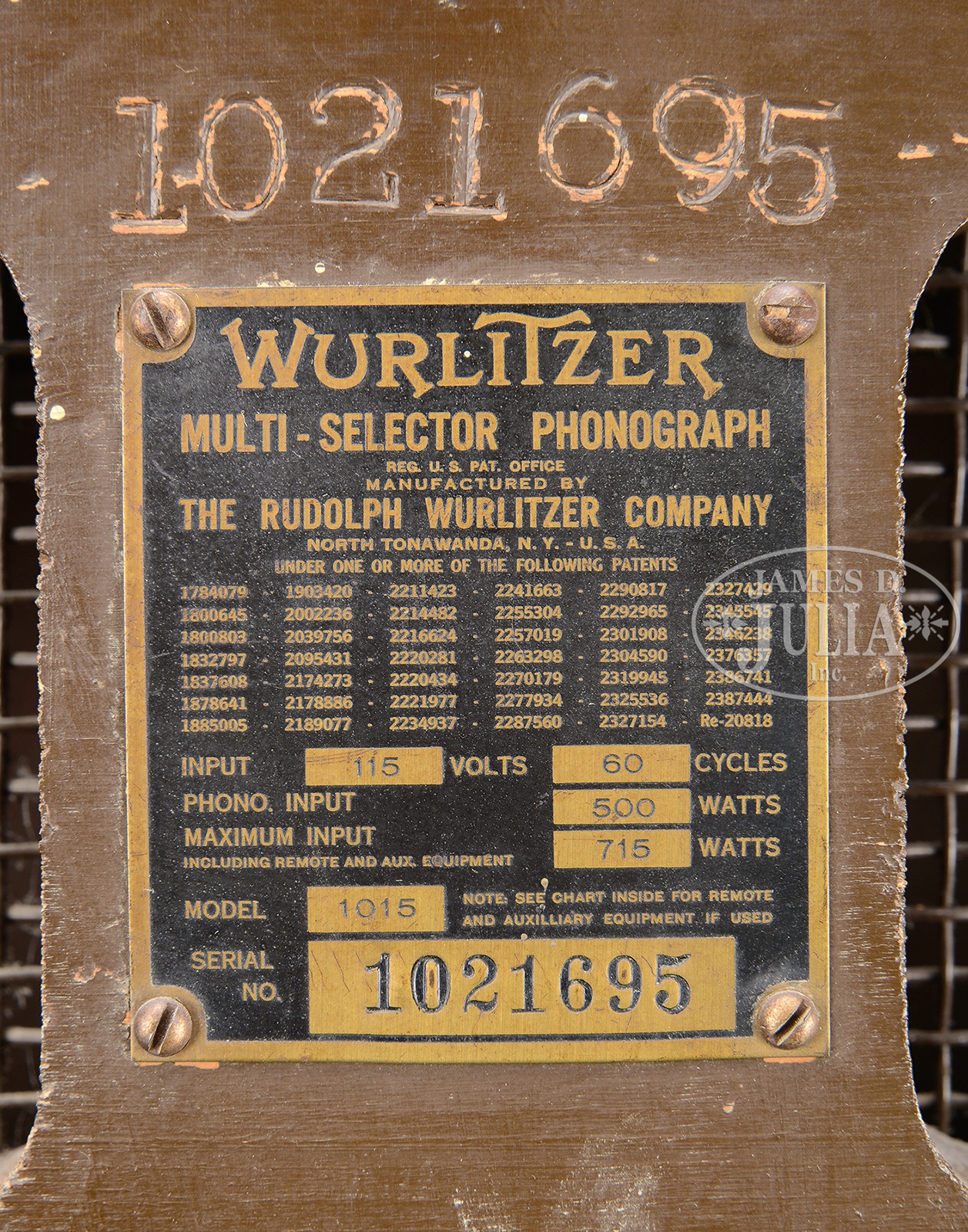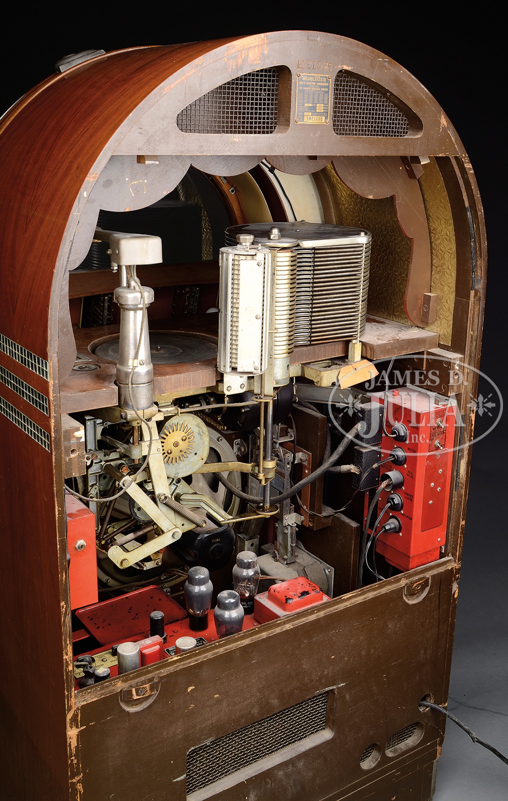 WURLITZER 1015 JUKEBOX.Great old jukebox of the 1940s with color lights, bubble tubes, and rotating color cylinders. Has been restored with new veneer, mirror inlays to cabinet, and all new plastics. Plays 24 different selections with the push of a button and has window on top for viewing record while playing. Set for free play but coin mechanism still intact. Comes with a full rack of jukebox classics. SIZE: Overall is 32″ w x 25″ d x 59″ h. CONDITION: Near excellent restored condition. 1086-3 (3,000-5,000) – Lot 2206 Auction: Advertising, Toy & Doll - Spring 2015 Please Note: All prices include the hammer price plus the buyer’s premium, which is paid by the buyer as part of the purchase price. The prices noted here after the auction are considered unofficial and do not become official until after the 46th day. |