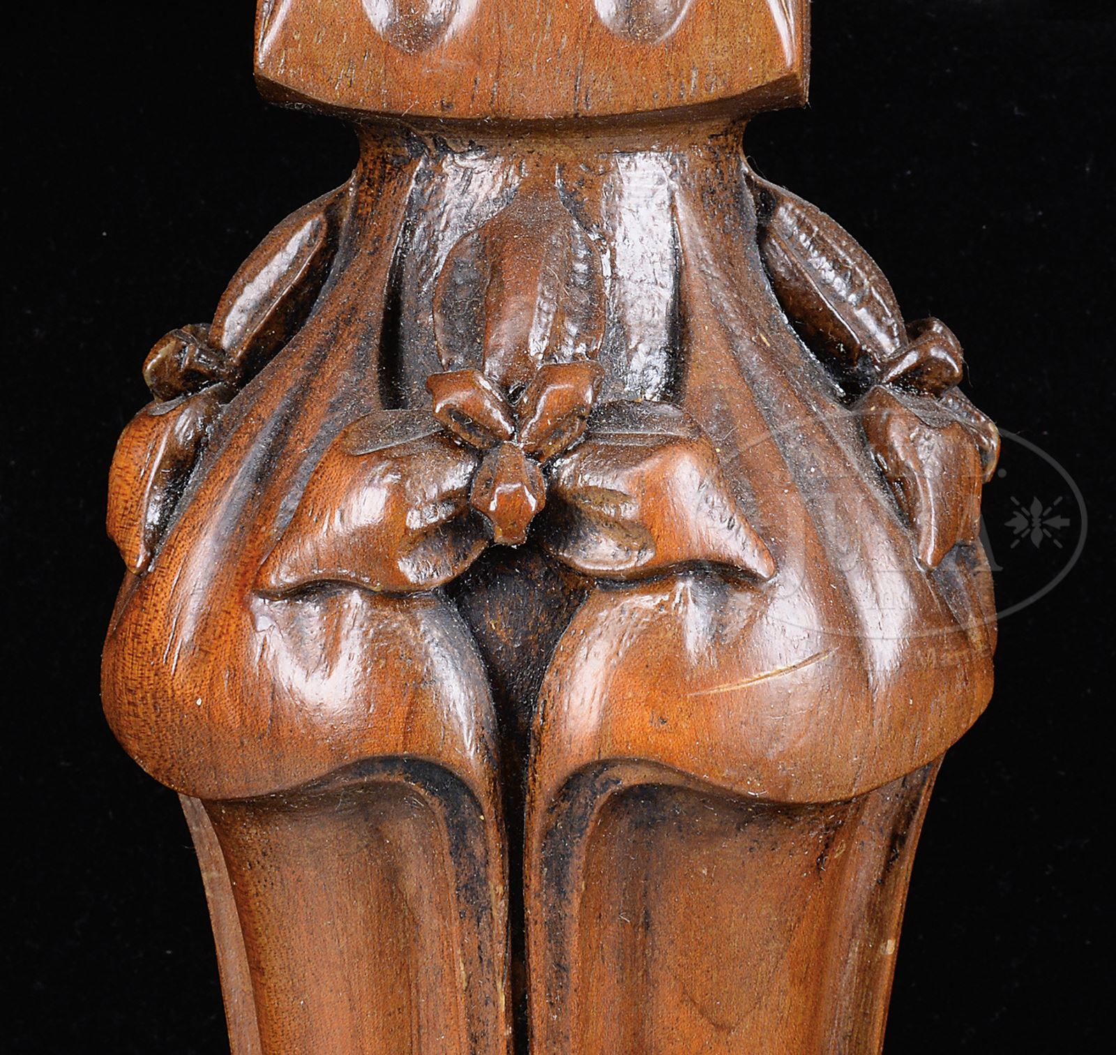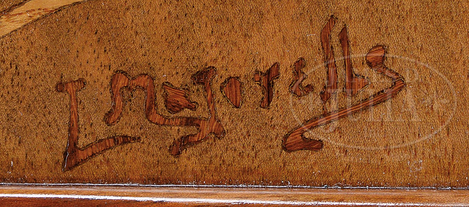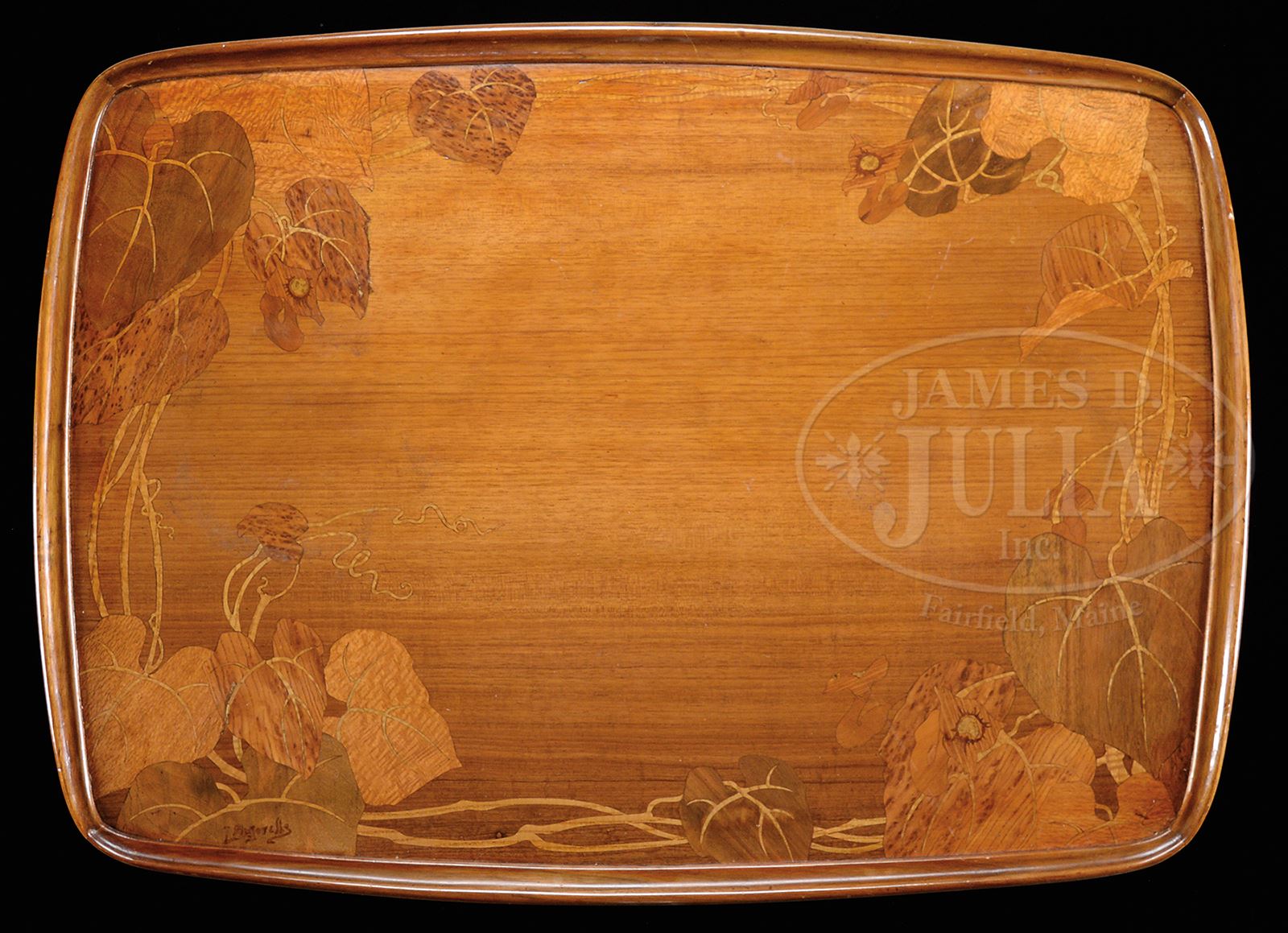 MAJORELLE ART NOUVEAU MARQUETRY DESK.Circa 1905, Louis Majorelle, France. This fine example signed “L. Majorelle” at corner of the top within a leaf. The rectangular tray top with swelled sides with marquetry vinery of varying exotic hardwoods forming the border. The top projecting above the molded frieze fitted with a single drawer raised on carved molded tapering legs headed by flower heads and tapering to a pointed foot. Note: An identical example is illustrated in Louis Majorelle Master of Art Nouveau Design by Alastair Duncan, published 1991, see page 204, figs. 131-133. SIZE: 30″ h x 35″ l x 25-1/2″ w. CONDITION: Table retains original cleaned French polished surfaces. Top with minor and minimal indentations. Otherwise very good. 50429-92 (5,000-7,000) – Lot 2206