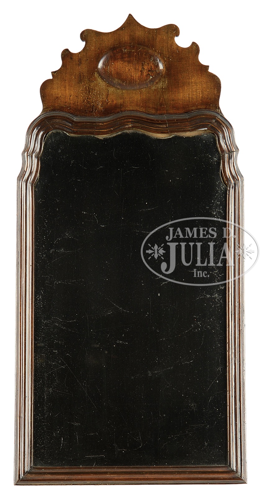 SCANDINAVIAN MAHOGANY LOOKING GLASS IN THE QUEEN ANNE TASTE.Second half 18th century, Denmark. The rectangular beveled mirror plate with scalloped and shaped edge within the conforming wavy molded frame surmounted by a scalloped pressed shallow oval depression. The crest and frame back with chamfered edges. SIZE: 31″ t x 15″ w. PROVENANCE: Downeast Maine home, descendant of Knud Rasmussen, famous Danish arctic explorer whose “greatest achievement” was the massive Fifth Thule Expedition (1921–1924) being sold unreserved. CONDITION: Mirror with old and original surface. Mirror plate original as is backboard, now with chocolate brown patina. Very good overall. 51323-6 (500-800) – Lot 2206