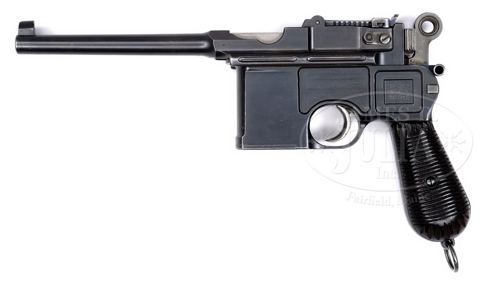 Please note typographical error: This gun is antique, not modern. *◊ MAUSER C96, EARLY TRANSITIONAL LARGE RING, ADDED HOLD-OPEN.SN 13257. Cal. 7.63mm. Early transitional Large Ring with standard 5-1/2″ bbl, fixed front sight and pinned rear sight marked “50-500”. Long extractor and independently secured firing pin. Chamber marked with usual 3-line address. Crown/Crown U on left chamber flat. Antler proof on right chamber flat. A hold-open has been professionally added to the left side of bbl extension that will keep the bolt retracted while charging the magazine. Importer marked “VON LENGERKE & DETMOLD/NEW-YORK” on left side of frame. Extensive disassembly shows all matching parts including grips, though firing pin not checked. Major components are rust blued. Extractor, sight cursor, bolt stop, firing pin retainer, safety and grip screw are fire blued. Trigger is in the white. Serrated wood grips with custom facets added to upper & lower portions of each panel. Lanyard ring present. PROVENANCE: Collection of Dr. Geoffrey Sturgess. CONDITION: Approx 97% orig rust blue with minor contact wear to bbl, forward magazine well, rails, and frontstrap. Comparable condition fire blue on small parts showing no suggestion of touch up. Dark grips that have been restained, including their inner surface. Mirror bore with strong rifling. Perfect manual mechanics. A very attractive and desirable importer marked Early Large Ring Transitional with a special hold-open. 4-53019 (3,000-5,000) – Lot 2207