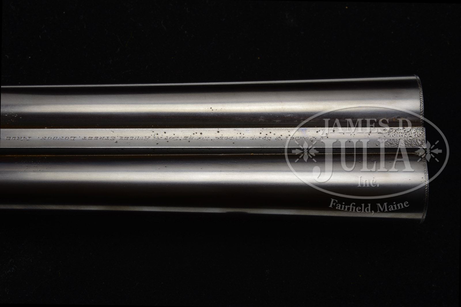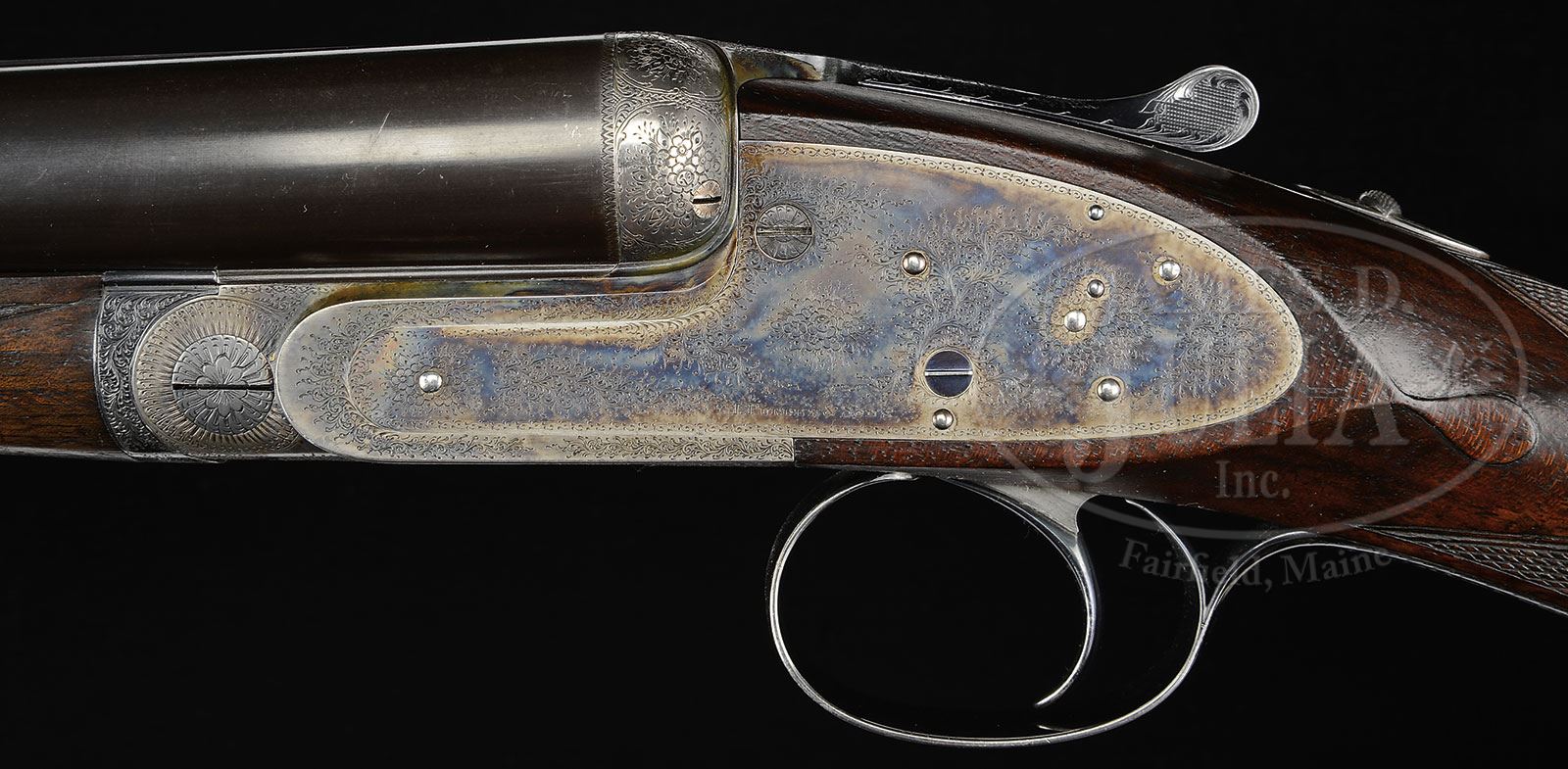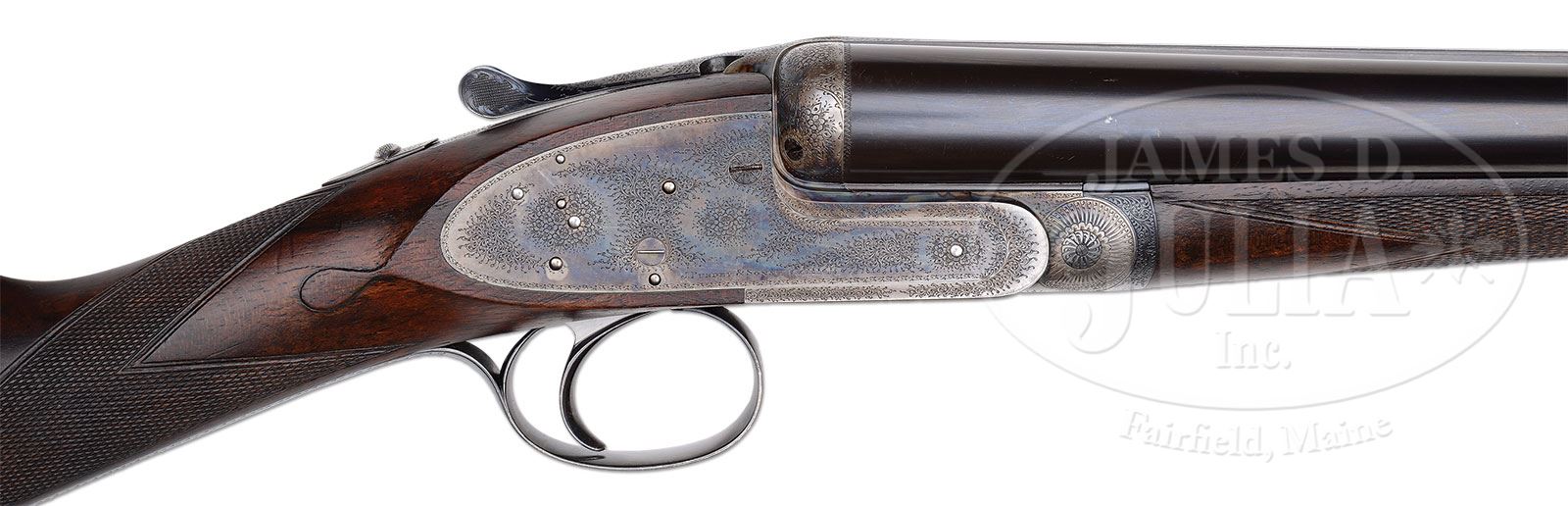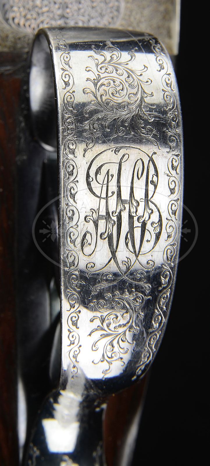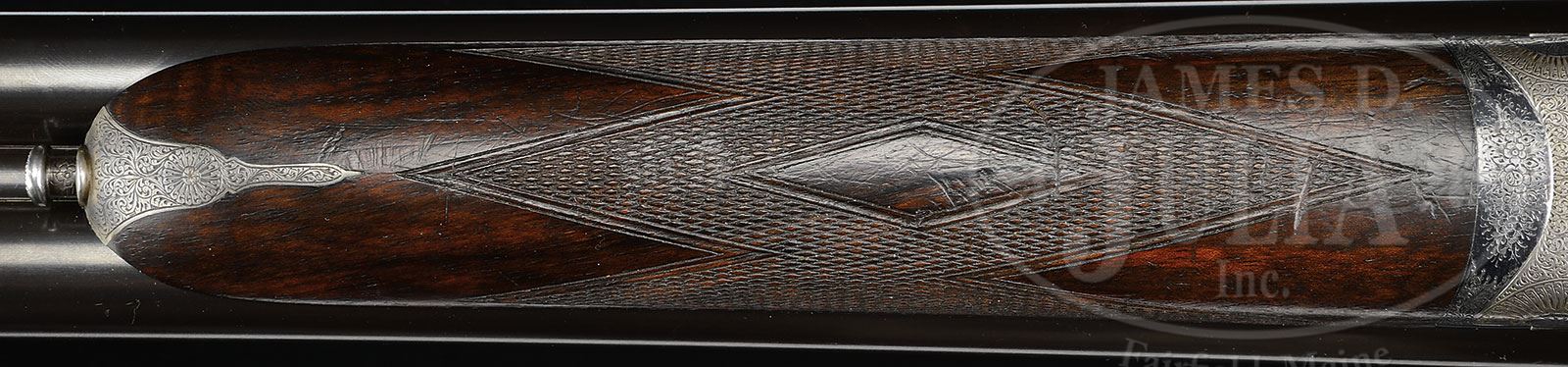 SN 23125. (1926) Cal. 12 ga. 2-5/8″ Chambers. 26″ and 28″ Chopper lump bbls are engraved with James Purdey & Sons famous Audley House address, and with Whitworth steel information on concave game ribs. Bbl flats are stamped with London nitro proofs for 1-1/8 oz of shot, and are also stamped “2-5/8”. Bottoms of rear lumps are engraved “Cylinder” on 26″ bbls, and “Choke” on 28″. Both bbl sets are engraved “Made in England” on splinter. 28″ Bbls have tube numbers “56613” and “56614”, and are stamped with bbl makers initials “SS” (Sam Simons). 26″ Bbls have tube nos “56607” and “56608” on loop, and bbl makers initials “AW” (Arthur Wilkes). Typical case hardened, Beesley type, self-opening, sidelock action features automatic safety (SAFE gold inlaid), bushed strikers, raised rib tumbler end cocking indicators, and non-selective single trigger. Action and lockplates are engraved with exceptionally well rendered Purdey house style small scroll and rose bouquets. “J. Purdey & Sons” is on each lockplate, and also on bottom of action over “London”. Scroll engraved trigger guard with SN at grip, has nicely engraved monogram “AHB” on bow. Darkly marbled, and lightly figured European walnut straight grip buttstock measures 13-7/8″ over checkered wood butt, and features graceful Purdey type drop points and typical point pattern checkering at grip. Matching splinter ejector forend with Anson release, has iron which is stamped “H” for long time Purdey actioner Fred Hughes. 26″ Bbl set: Bore diameter: left -.732, right -.732. Bore restrictions: left -.011 (Lt mod), right -.004 (IC). Wall thickness: left -.027, right -.028. Drop at heel: 2-5/8″, drop at comb: 1-11/16″. Weight: 6 lbs 5 oz. LOP: 13-7/8″. 28″ Bbl set: Bore diameter: left -.731, right -.732. Bore restrictions: left -.028 (I Mod), right -.010 (Lt. Mod). Wall thickness: left -.021, right -.025. Drop at heel: 2-9/16″, drop at comb: 1-11/16″. Weight: 6 lbs 4-1/2″ oz. LOP: 13-7/8″. PROVENANCE: Obituary of Alfred S. Warren, Jr., prior owner, with other note: “the motor case for this gun is in the Detroit area … with “AHB” monogram intact.” CONDITION: Excellent. 26″ Bbls retain approx 95% of what appears to be orig blue, with some silvering at muzzles and a few scattered overall light marks. They still retain damascening on breech ends. 28″ Bbls retain nearly all of a fine quality re-blue over considerable external pitting. Action retains most of its orig case hardening color, silvered at normal carrying points. Lockplates retain nearly all of their fine orig case hardening color, right lock slightly silvered at tail. Trigger plate, guard, and top lever retain over 85% of what appears to be orig bright blue with slight silvering on sharp edges, and at thumbpiece. Stocks retain over 90% of what appears to be orig rubbed oil finish with numerous light marks. There are some deeper scratches on butt, and considerable scratches and dents on forend, mostly in checkering, which is slightly soiled and worn. Bores of both bbl sets are excellent, showing only the lightest of fine scratches from cleaning and use. Action is tight. Both bbl sets are on face. Drop is excellent. Ejectors are in time. Single trigger works. A fine, fast handling, high condition gun from the 20’s. 4-51237 MGM1 (12,500-22,500) – Lot 2208