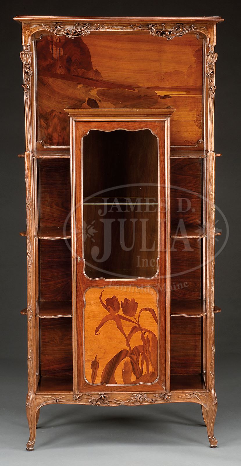 FINE AND RARE MAJORELLE ART NOUVEAU MARQUETRY DISPLAY CABINET.Circa 1900, Louis Majorelle, Nancy, France. The rectangular cabinet with central floral marquetry panel door opening to an interior fitted with two plate glass shelves flanked by three shaped molded rosewood fixed shelves. The back case panel with marquetry landscape signed “L. Majorelle Nancy” in the lower right facing corner of the panel. The cabinet with floral vinery in deep relief on the frontal supports, the apron similarly carved and all raised on short cabriole legs terminating in sabots. Note: The identical etagere illustrated in Louis Majorelle Master of Art Nouveau Design by Alastair Duncan, 1991, see page 61, figure 25. SIZE: 68″ h x 32-1/2″ w x 15/1/2″ d. CONDITION: With some original French polished surfaces and now professionally repolished. Overall very good. 50429-95 (10,000-15,000) – Lot 2208