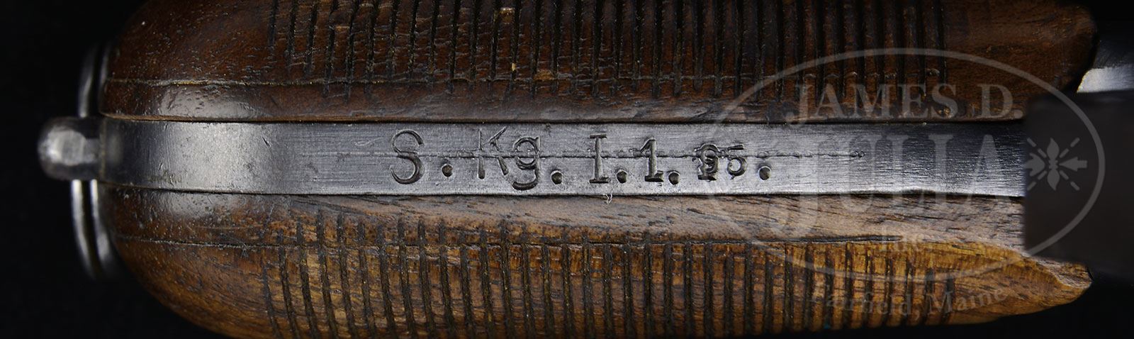 SN 16391. Cal. 9mm Parabellum. Post-war Red 9 rework with unmarked grips. 4″ bbl with sleeved front sight and fixed rear sight. Short extractor and 2-lug firing pin. Standard Mauser address on top of chamber. SN “16391” marked on left chamber flat. Crown/U proofing on left receiver flat and commercial Norwegian lion proof mark on rear just below sight. “1920” rework on right flat with Simson Eagle/SU/4 marking on right bbl extension. 2-line Mauser address on right side of receiver. Frontstrap has a crossed out “S.Kg.I.1.95.” police unit marking. Lanyard ring present. Major parts with era correct rust blue. Salt blued extractor, safety, trigger and floorplate. Disassembly shows all matching numbers except the grips whose SNs have been removed. An interesting history that reflects a Treaty of Versailles conversion of a Red 9 type C96 to a pistol with a 4″ bbl issued to the Wiemar Police. The gun was later reworked by Simson and later sold in Norway. Accompanied by a dark brown Wiemar-era holster with two pouches for stripper clips (one missing) and cleaning rod. Stud secured flap is owner marked on the inside “M.A. Schwarzkail / T.B.K. W.-Haven…”. Two belt loops on obverse side. PROVENANCE: Collection of Dr. Geoffrey Sturgess. CONDITION: Orig 95% blue with era-correct reworked mixing of rust blued & salt blued parts. Comparable condition finely serrated grips with scattered dings & losses. Grips with removed SNs often seen in this kind of rework. Slightly dulled bore with sharp rifling. Perfect manual mechanics. Very good holster with intact stitching, missing stripper pouch as noted, excellent generic cleaning rod. 4-52126 (2,000-3,000) – Lot 2209
